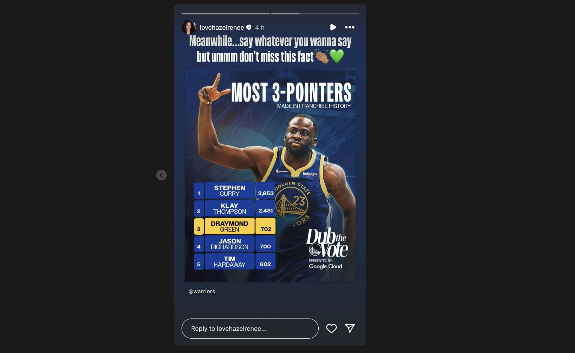 Draymond Green's wife, Hazel Renee, was amped after the Golden State Warriors star's latest milestone. Green, who is not known much as a 3-point shooter, made his mark for the Warriors in this category. After Saturday's 109-105 win over the Phoenix Suns, Green passed Jason Richardson on the Warriors record 3-pointers list.