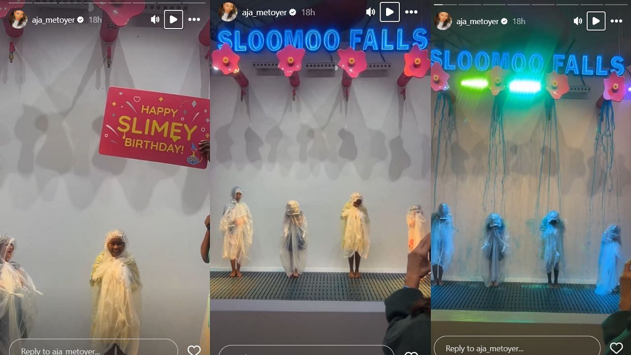Metoyer's first story featured a video showing off the birthday party venue. Four kids can be seen standing on the stage wearing raincoats as an announcer introduced the birthday event. The announer welcomed the attendees to the "Happy Slimey Birthday" as he held a placard with the same words in front of the audience.