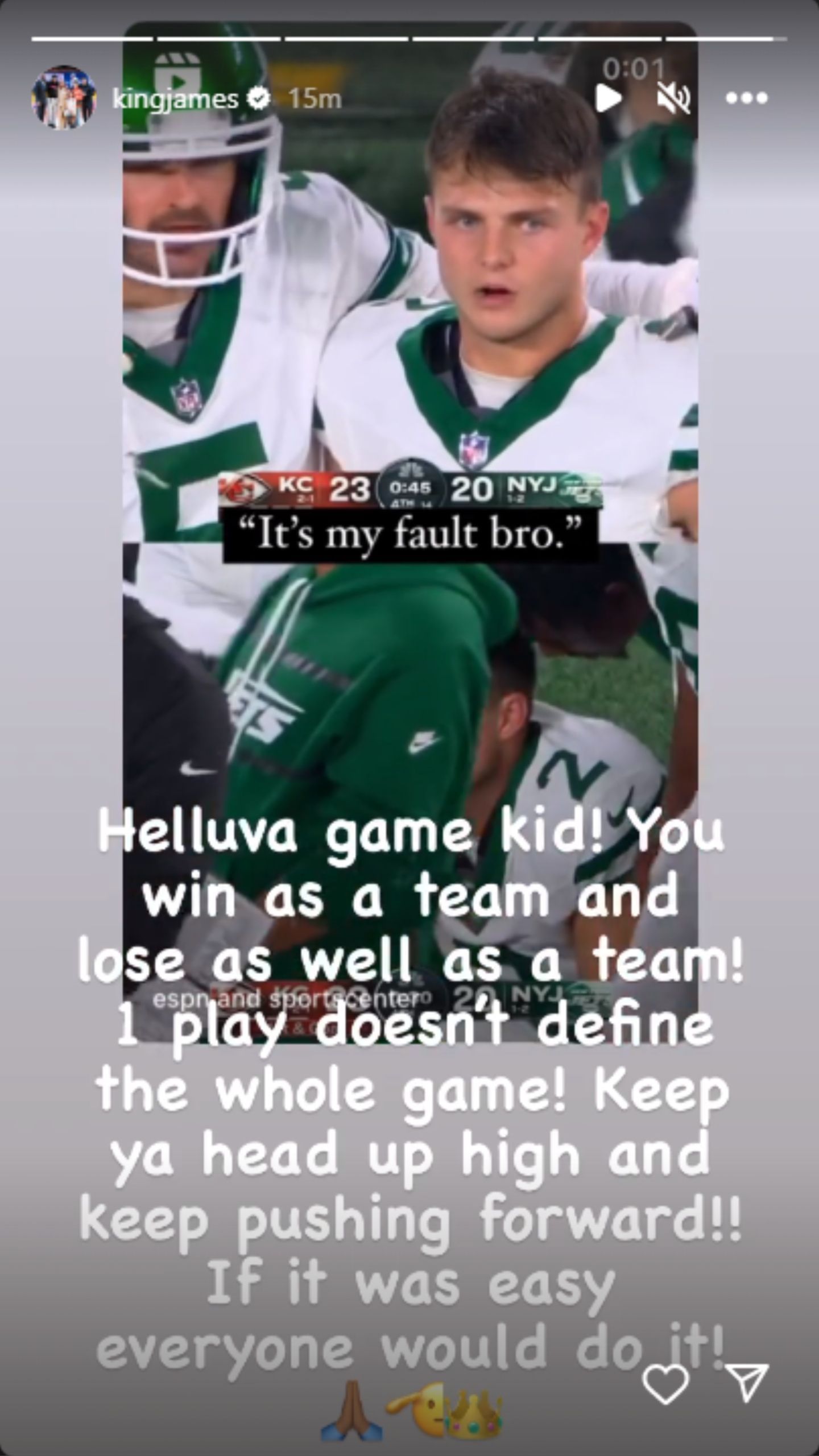 LeBron James sent encouraging words to Zach Wilson of the New York Jets following his heroic effort in their loss to the Kansas City Chiefs on Sunday. Wilson's late fumble cost the Jets their second win of the season, with the Chiefs improving to 2-0 with Taylor Swift in attendance.