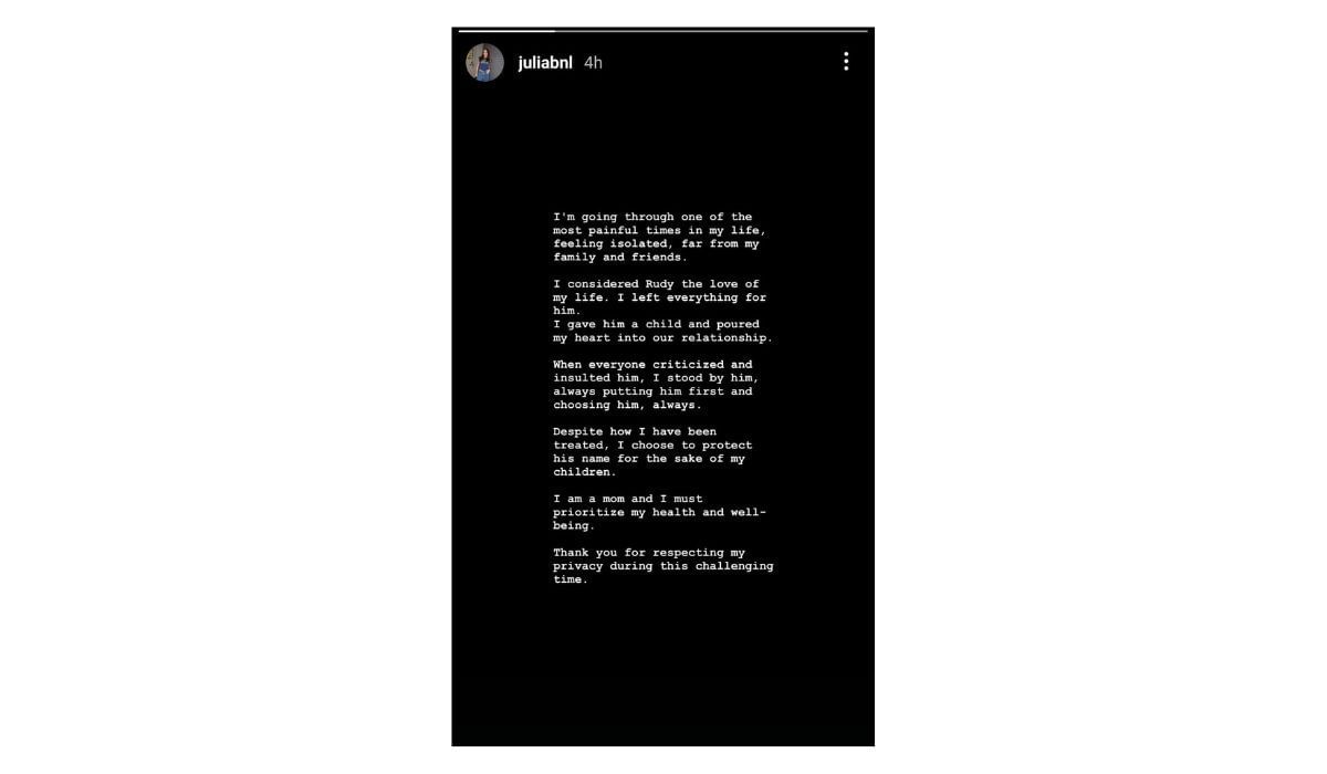 "Despite how I have been treated, I chose to protect his name for the sake of my children. I am a mom and I must prioritize my health and well being. Thank you for respecting my privacy during this challenging time."
