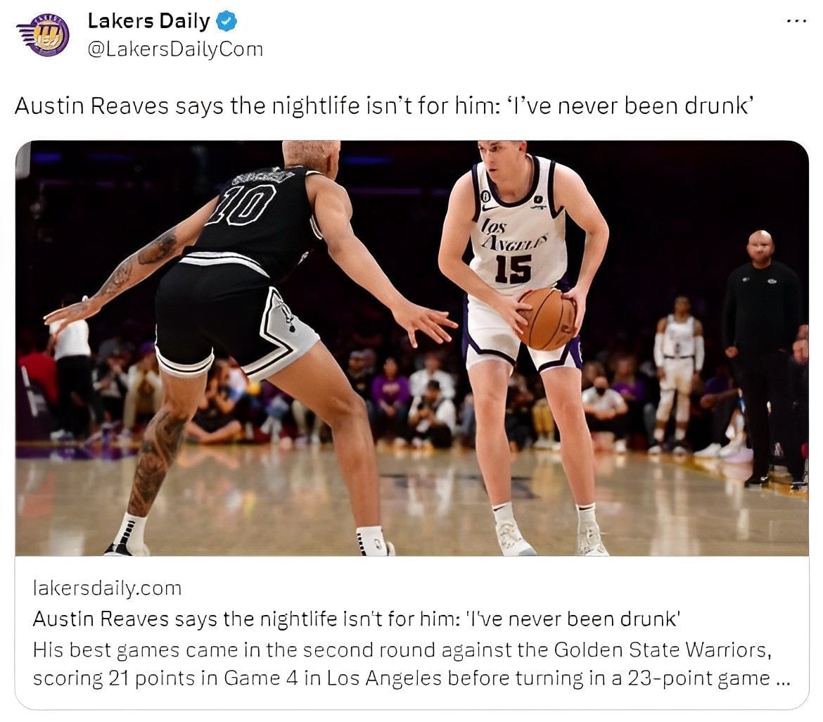 The LA Lakers had a real shot at contending for the NBA title last season, thanks to the heroics of Austin Reaves, who had his breakout year during the 2022-23 season. Despite living in Los Angeles, Reaves shared that he isn't a big fan of the nightlife and went so far as to say that he's never been drunk.