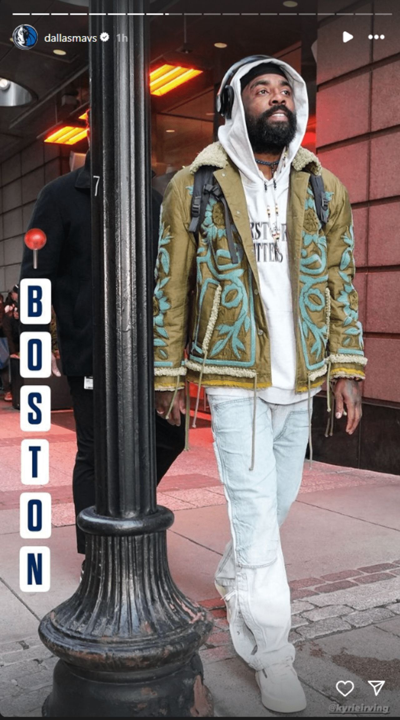 Kyrie Irving and the Dallas Mavericks are set to face the Boston Celtics at TD Garden in a marquee Friday night matchup. It seems that Irving was in a fashionable mood upon his arrival in Boston as he was spotted walking to the arena wearing a designer jacket created by Craig Green. The jacket "KAI" wore featured green and blue colors with a floral design that matched the Mavericks star's spirituality.