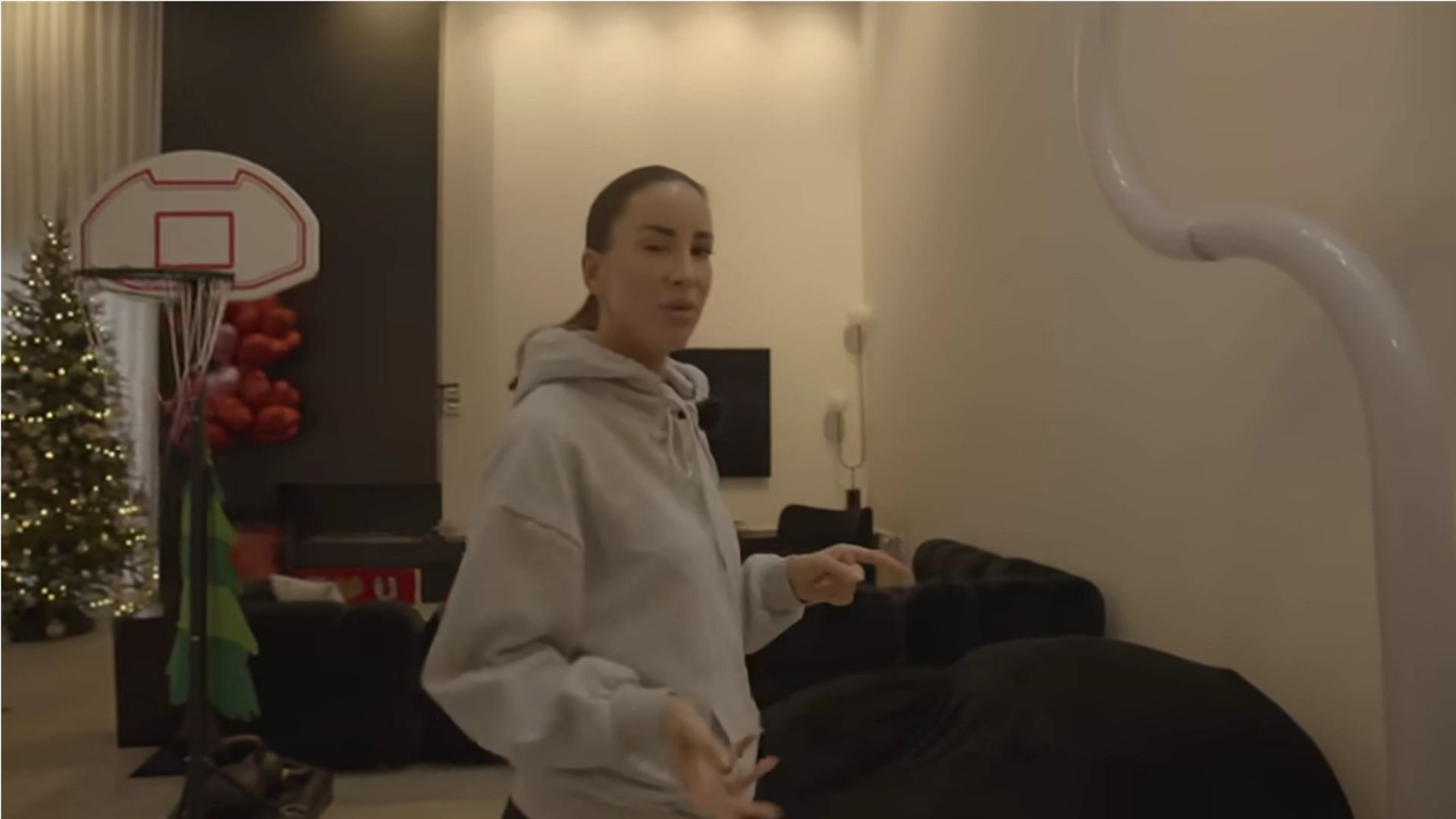 Ellen began the tour with the living room and dining area, both of which had a simple white, gray and black motif. The spacious living room included a fancy, elongated lamp, an enormous couch and a sizable basketball hoop.