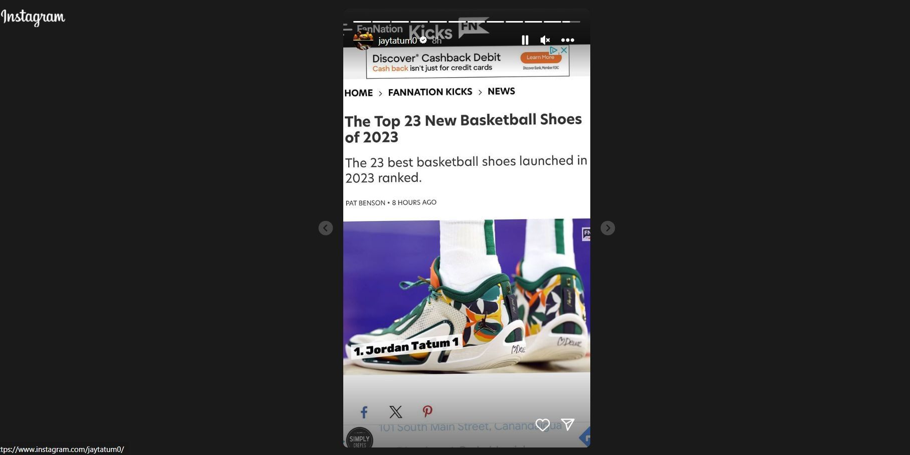 Jayson Tatum is overjoyed that his signature shoes, the Jordan Tatum 1s, have been named the best kicks for 2023 by Sports Illustrated's Pat Benson. Tatum reshared Benson's report on his Instagram story along with the list's cover photo.
