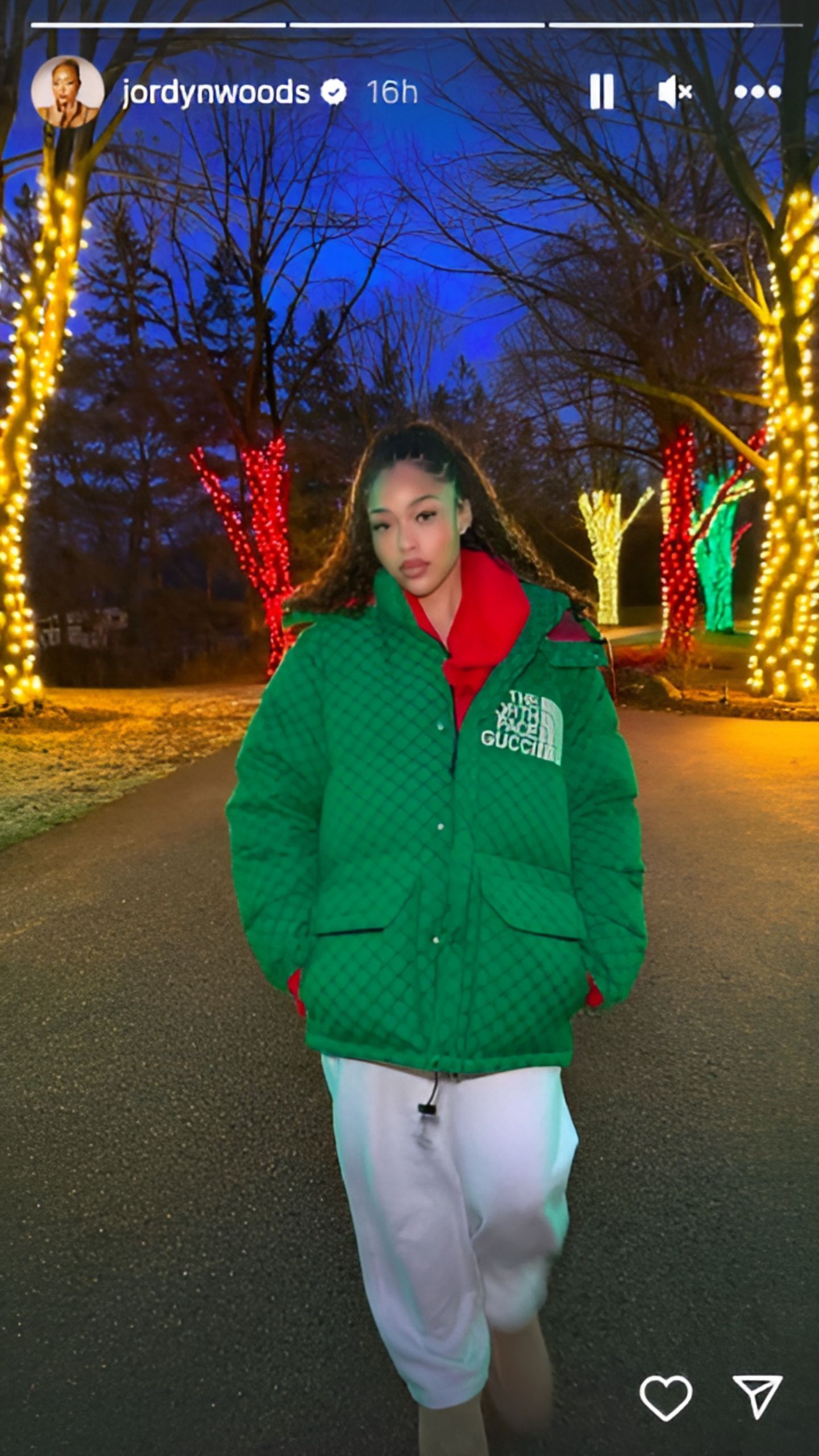 The North Face Gucci jacket symbolizes a collaboration between the outdoor brand The North Face and the fashion giant Gucci. Woods posed in the green colored jacket and paired her look with white joggers.