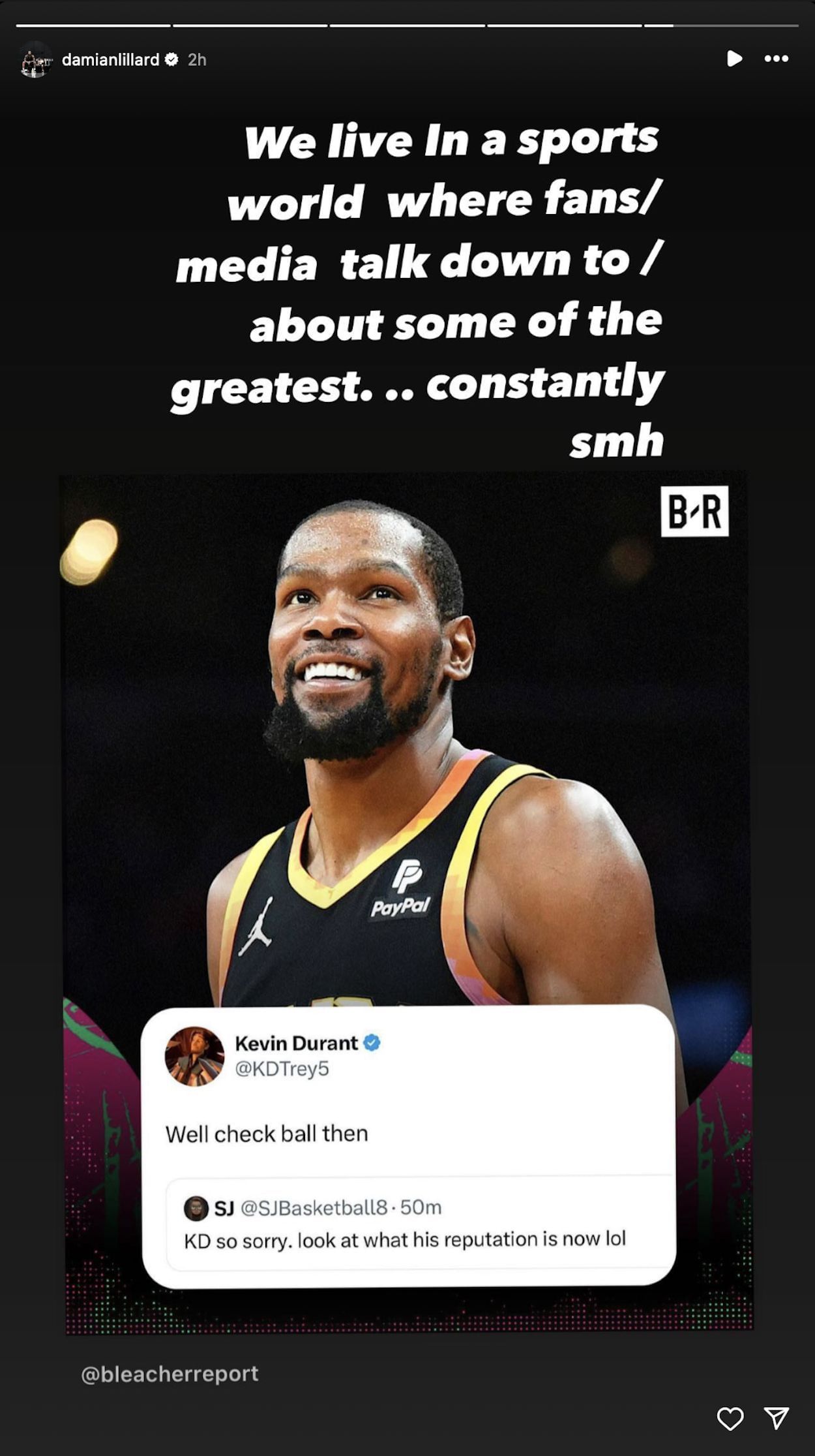 While reposting a screenshot of KD's response to the fan in question, Lillard included his own thoughts, writing: