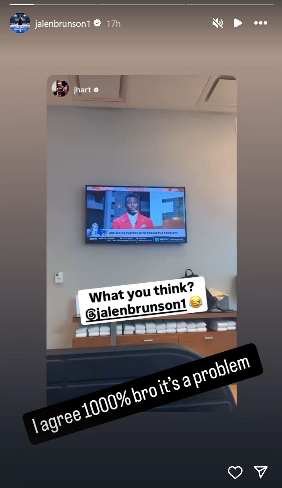 Josh Hart posted a story on his Instagram which had a snippet of the segment where the text on the screen read, "Are active players with a podcast a problem?" Hart then tagged Jalen Brunson in the story asking him what he felt: