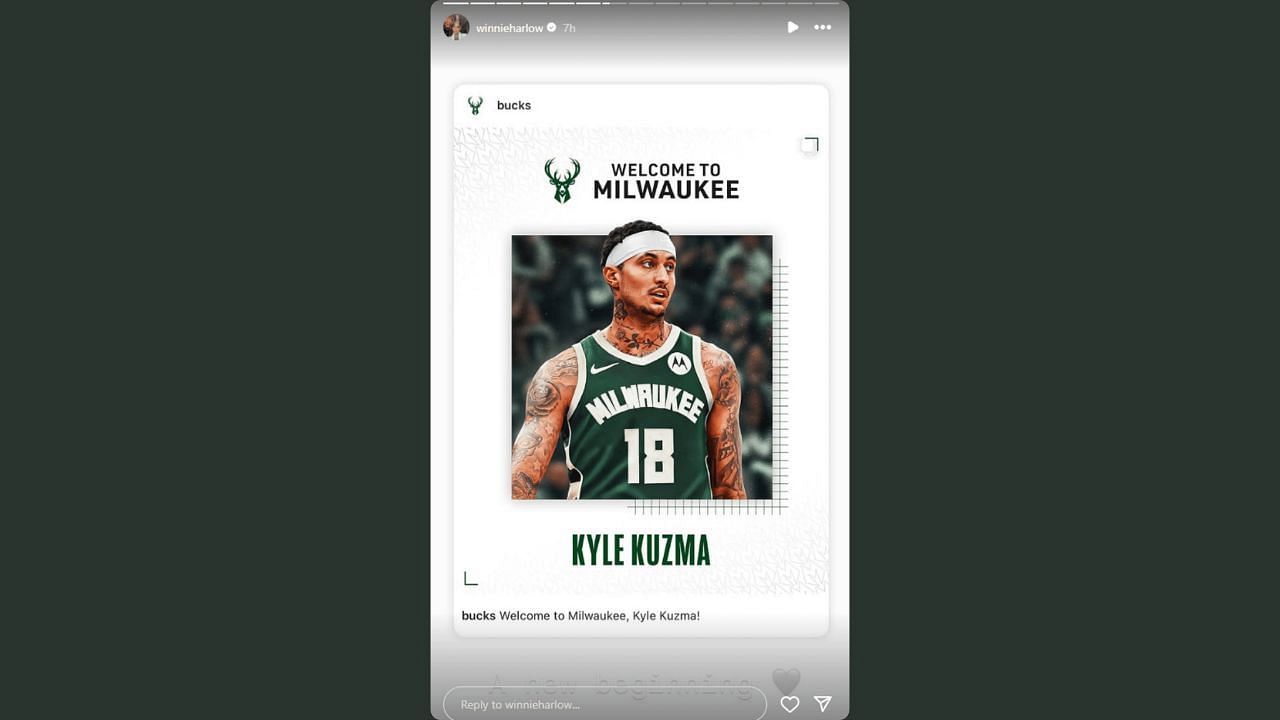 After the trade, the Bucks posted a message on Instagram to welcome the former Wizards star. Kuzma's girlfriend shared the post on her Instagram story and captioned it: