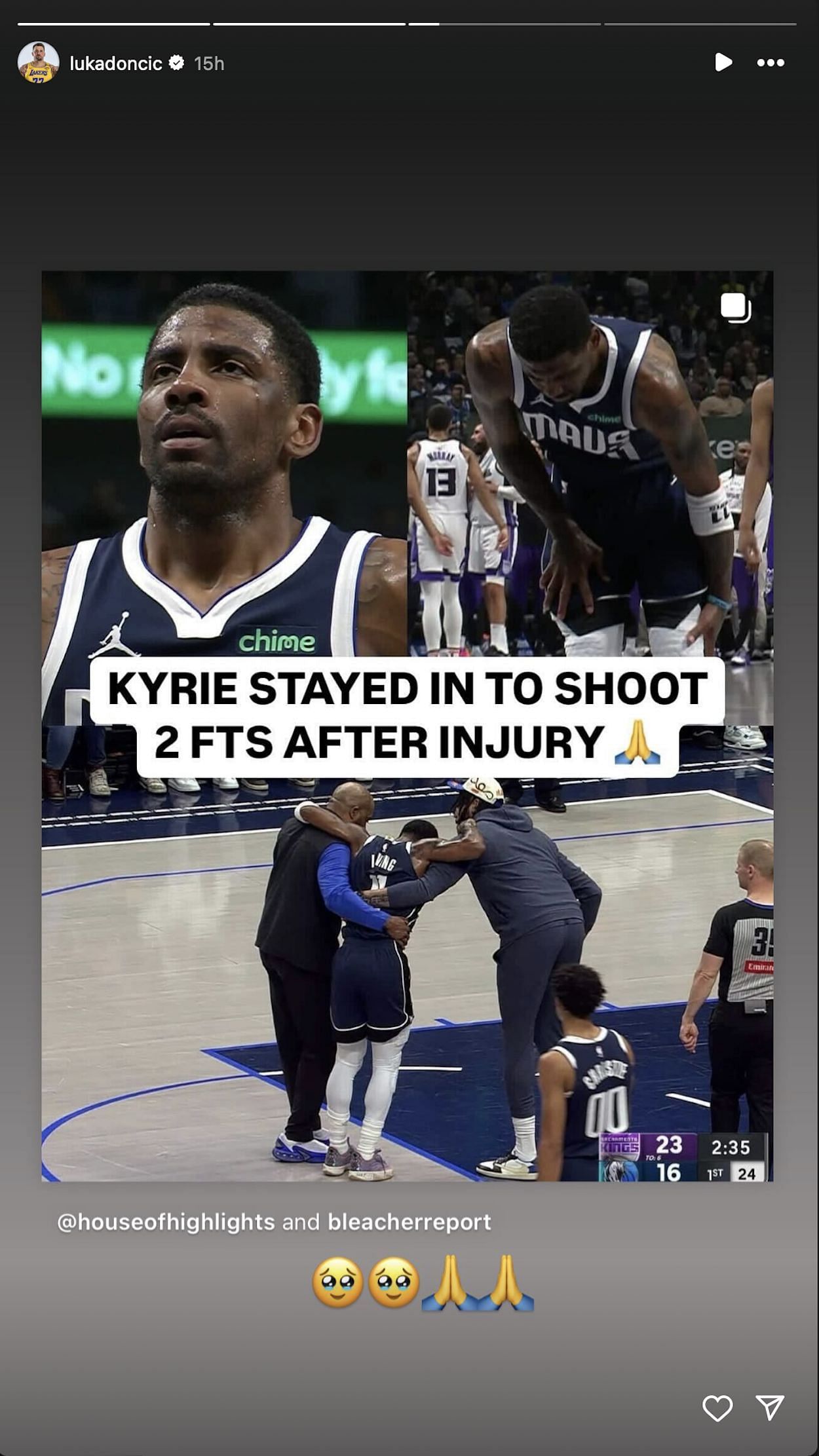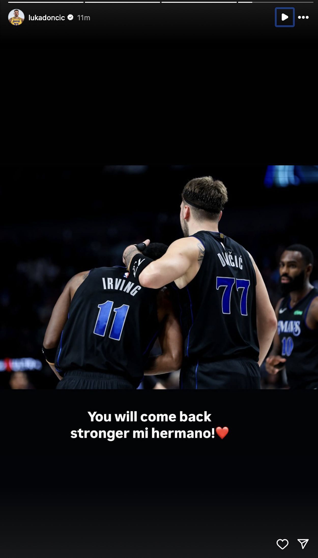 Now, in the wake of Irving's ACL injury on Monday, the roles are reversed, with Doncic worried about his friend and former teammate. In a heartfelt post on his Instagram story in the wake of Irving's injury being confirmed as an ACL tear, Doncic wrote: