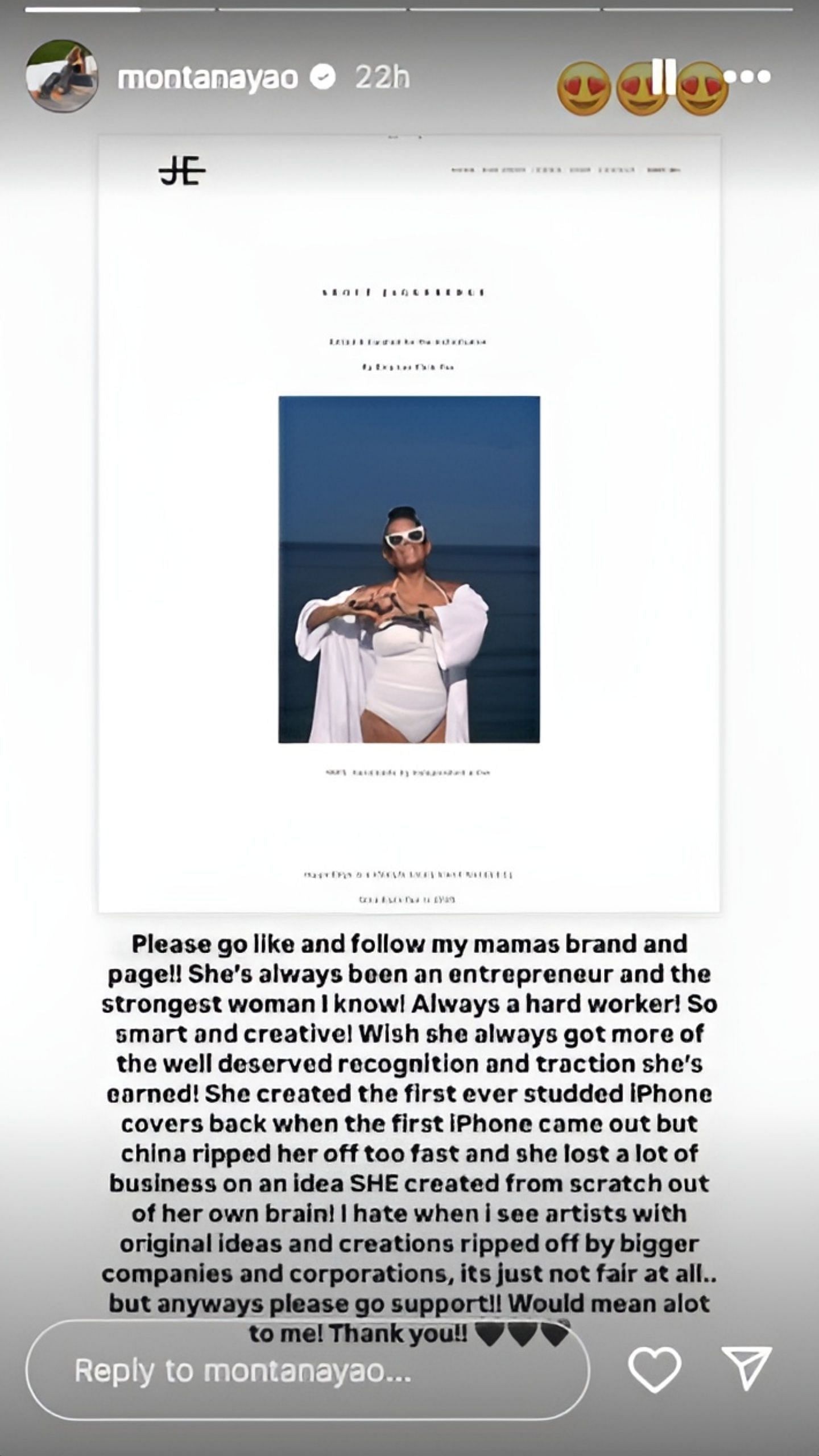 In the caption, Yao hailed her mother's strength and her knack for effective business ideas. She also added that it was her mother who was the first creator of "the studded iPhone covers." However, according to Yao, China stole her mother's idea: