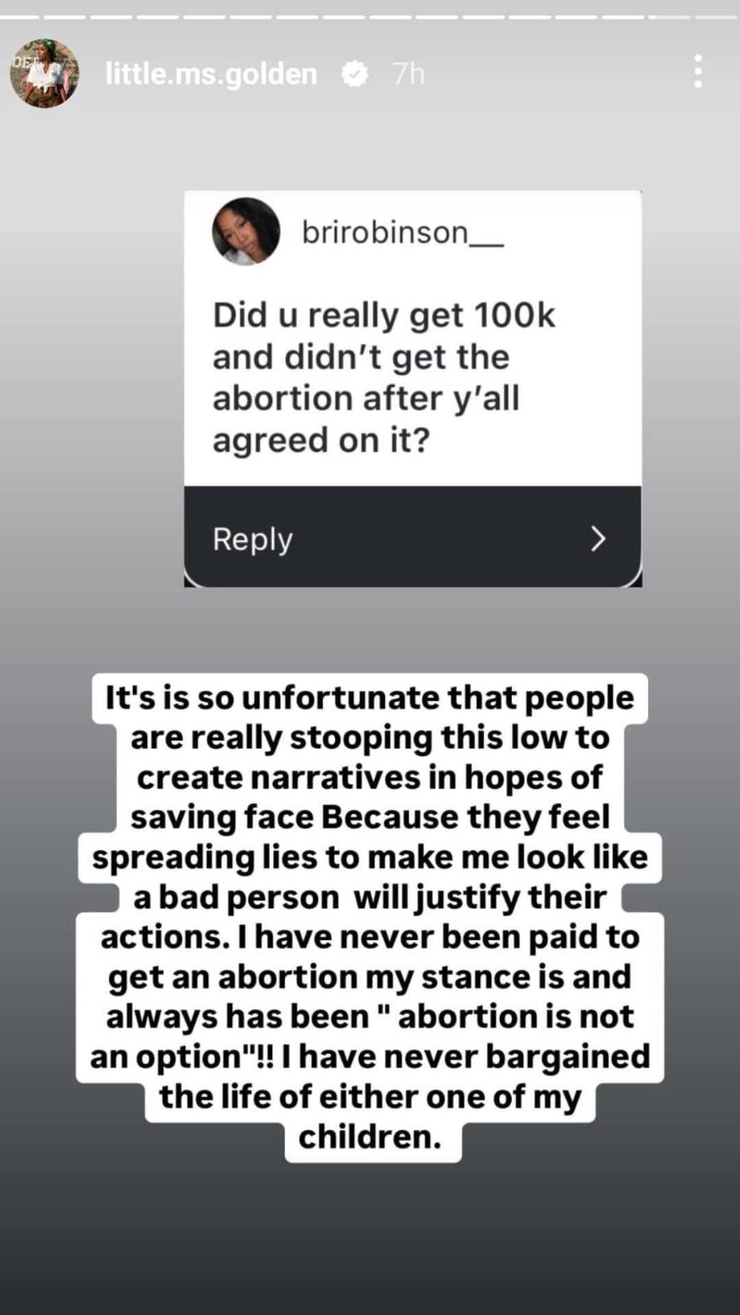 In a now-deleted Instagram story during an "ask me anything" round on Monday, a fan asked Howard if she "didn't get the abortion" after allegedly agreeing and accepting $100k from Edwards to do so. In response, Ayesha dismissed the allegations as a lie, citing that abortion is not an option for her.