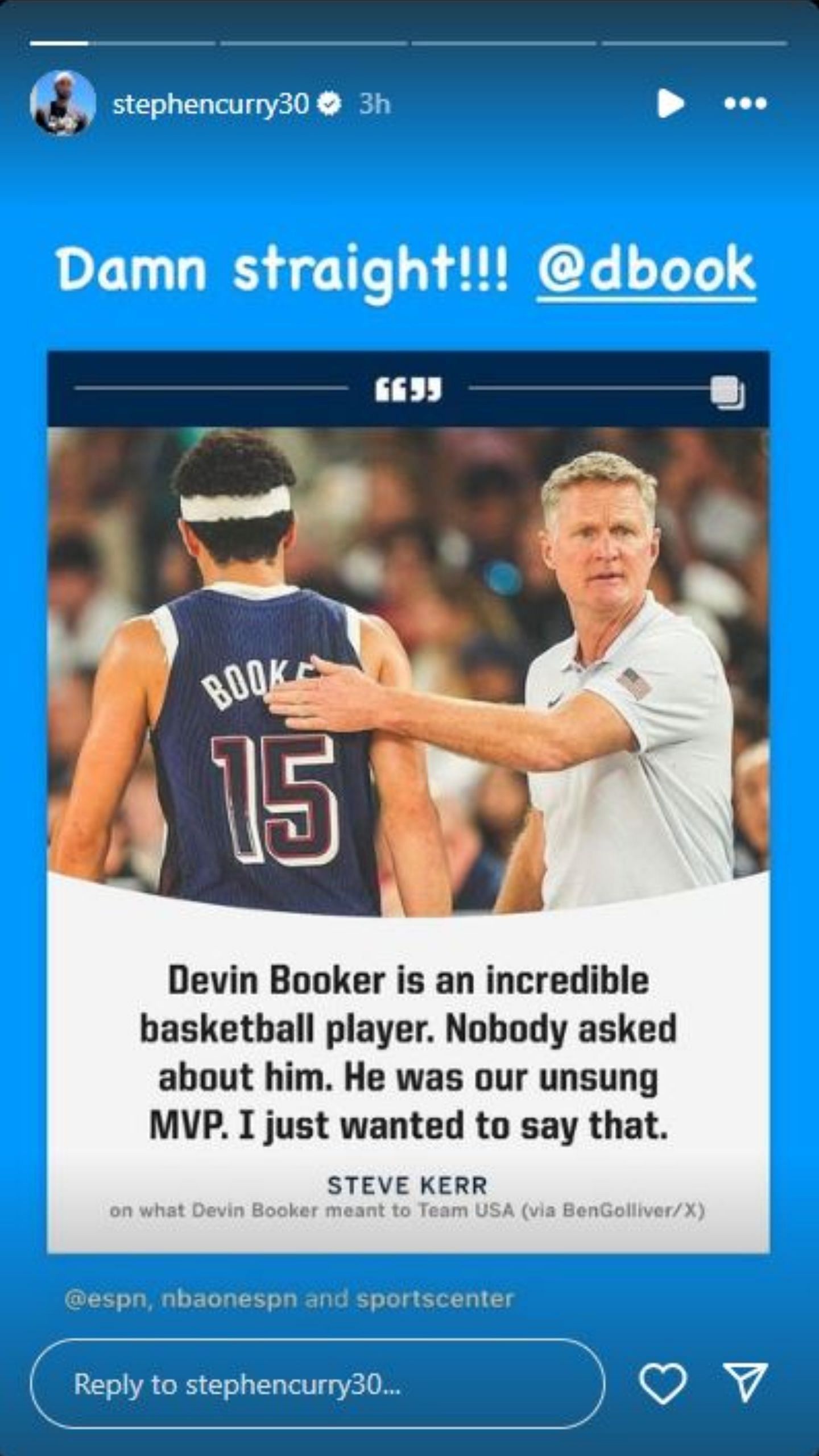 In a post on his Instagram stories, Curry shared a quote from head coach Steve Kerr praising Booker's play for Team USA in the tournament. Booker's contributions have not been talked about enough, with Kerr and Curry making sure it doesn't go unnoticed.