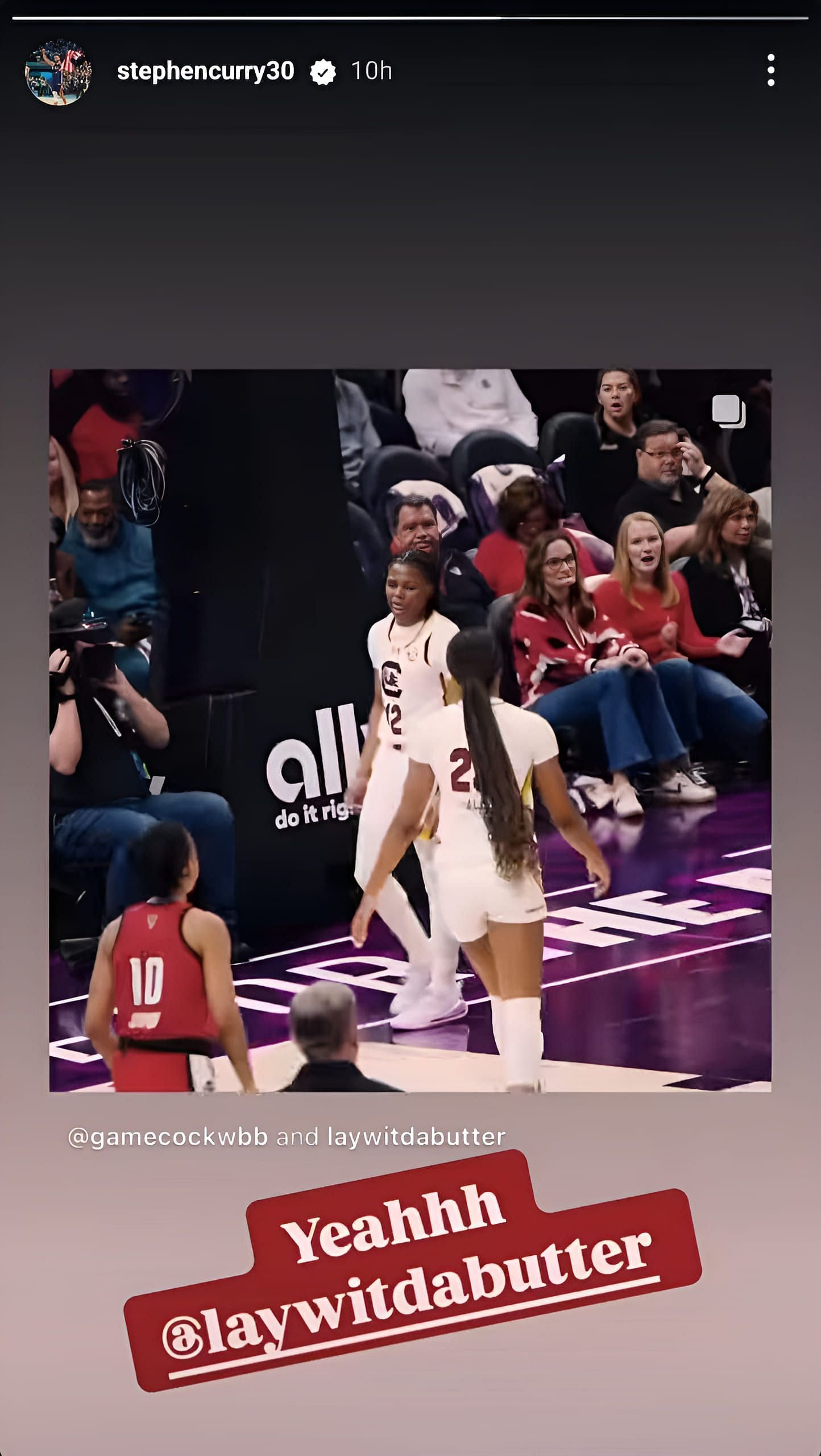 Golden State Warriors star Stephen Curry shared his reaction to the Curry Brand’s first-ever collegiate superstar’s defensive play. On Monday, Curry reposted South Carolina women’s basketball star MiLaysia Fulwiley’s block against North Carolina State University, hyping her up for the emphatic rejection.