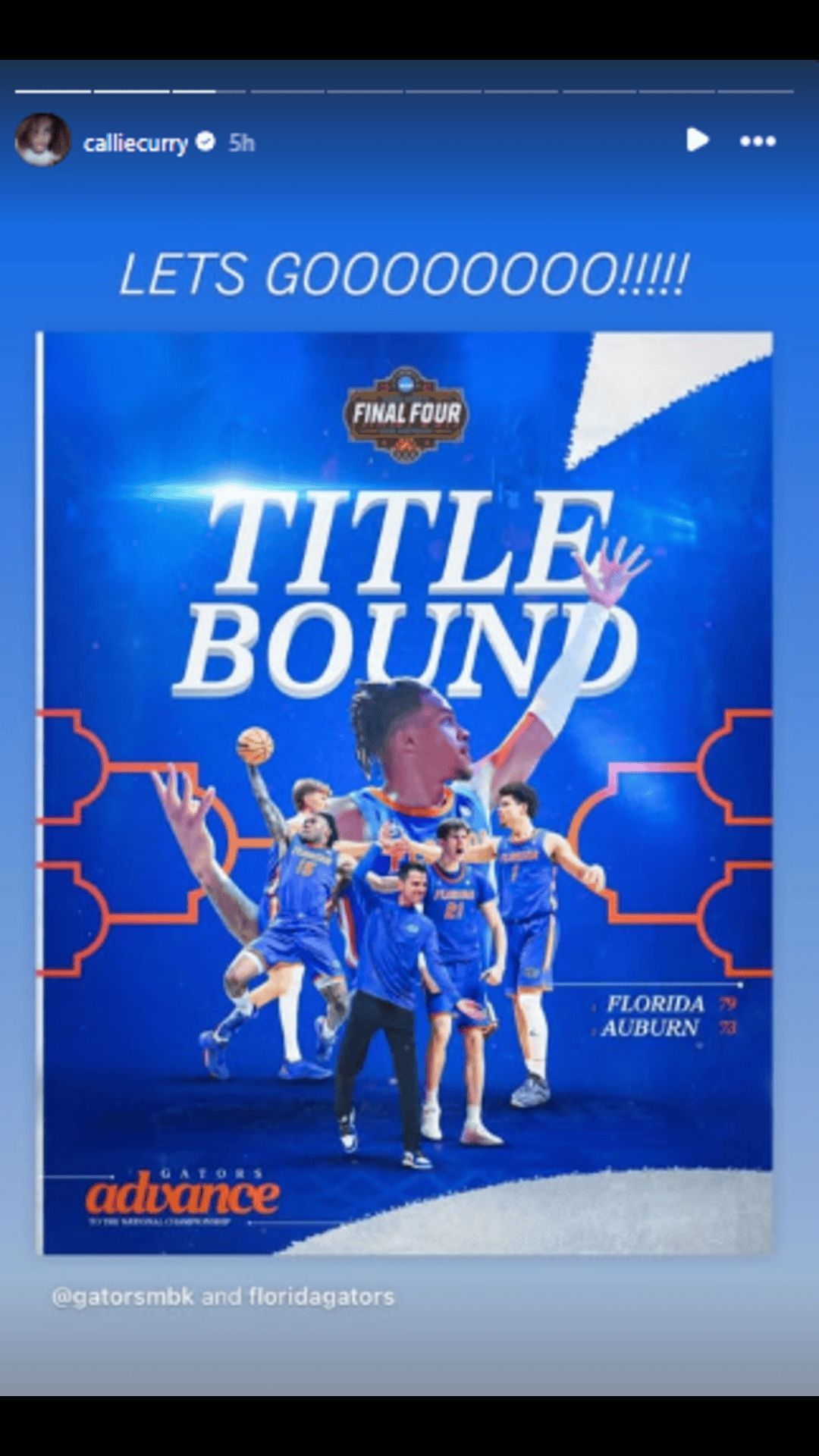 In the other Final Four bracket, Rivers-Curry's alma mater Florida defeated Auburn 79-73. After the Gators advanced to the national championship game, Rivers-Curry celebrated the victory on Instagram: