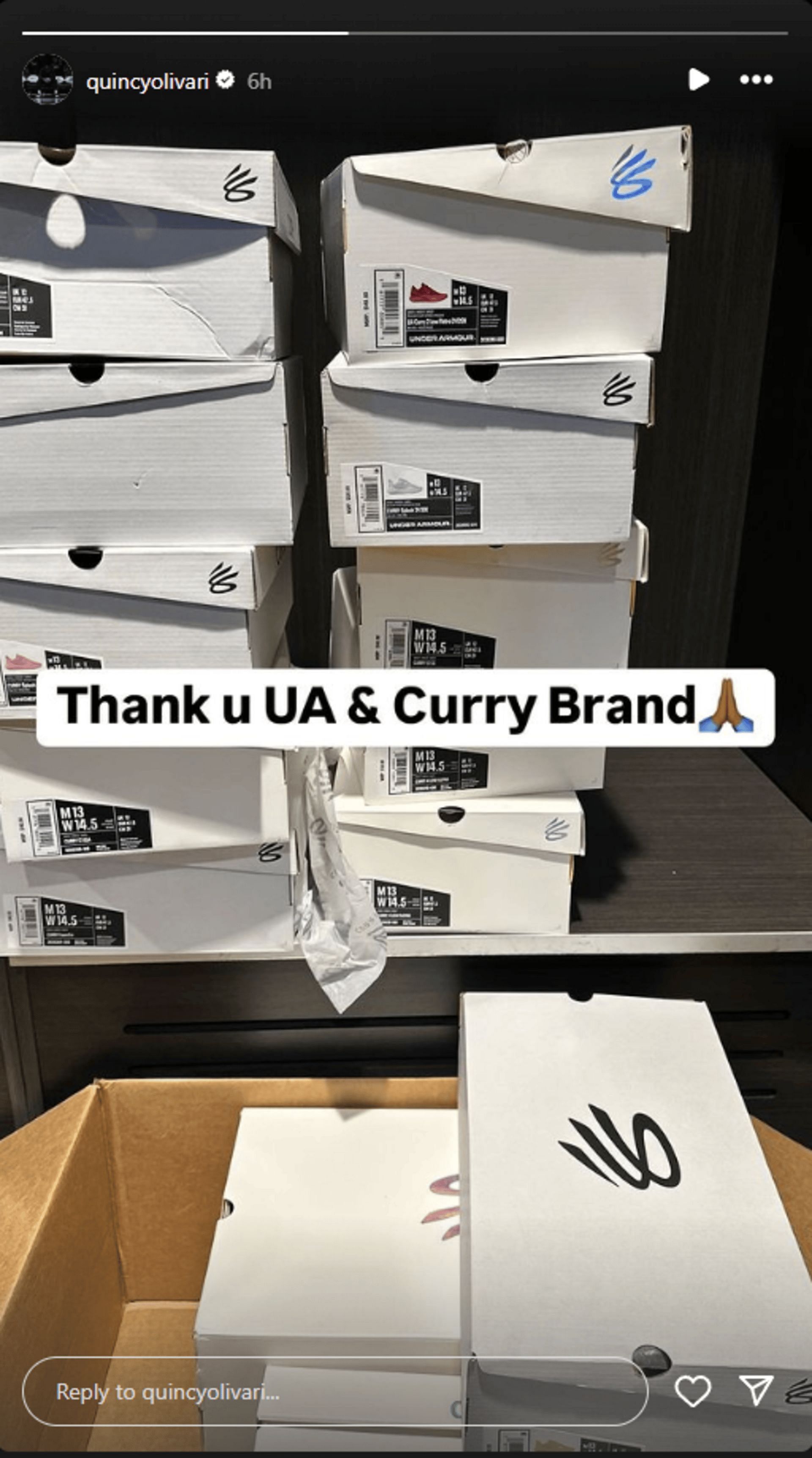 Quincy recently posted a picture on his Instagram stories showing a pile of Steph Curry sneakers still inside their boxes. The caption of the image suggests that Curry sent these shoes over to the rookie, likely making him feel emotional about the surprise.