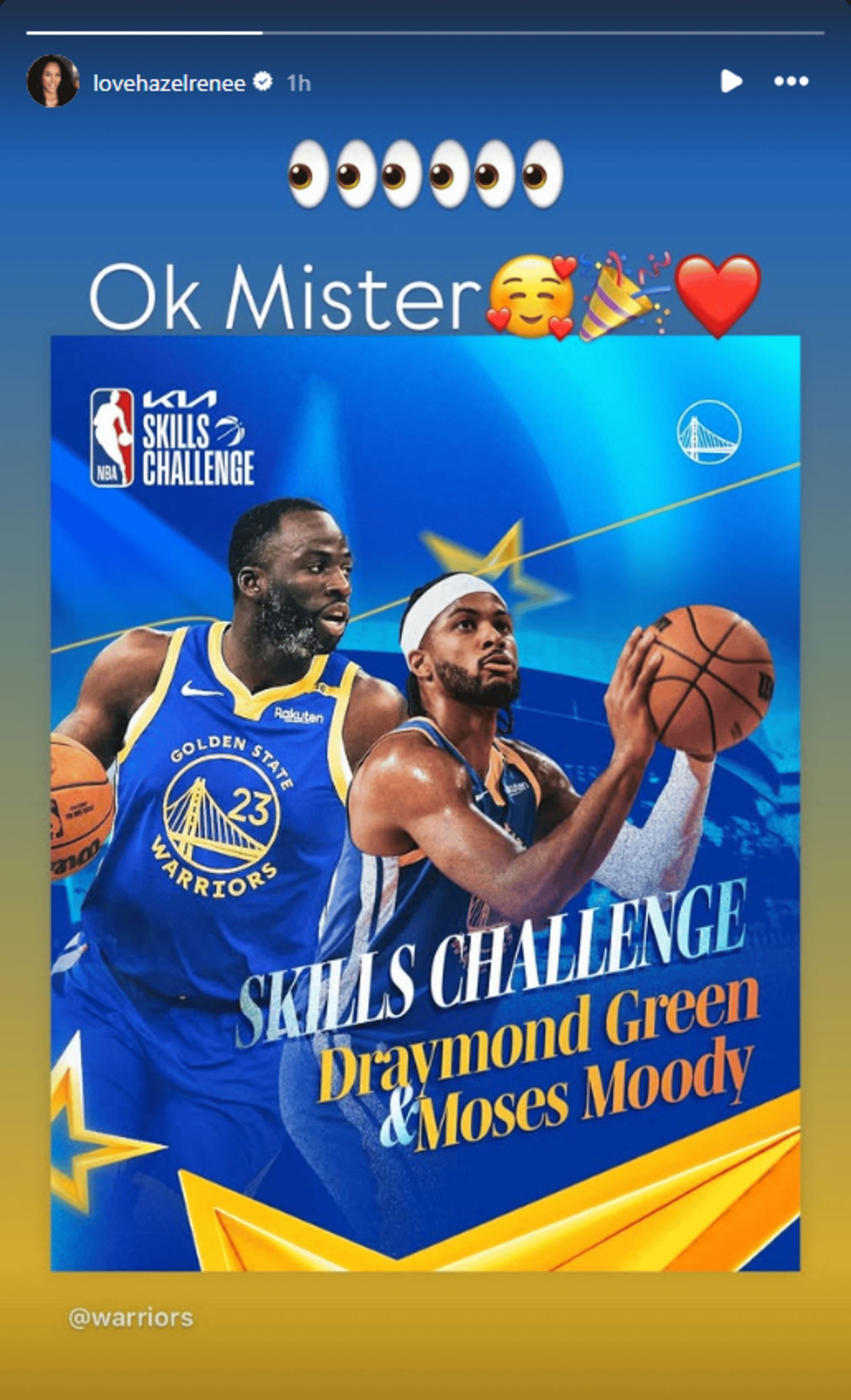 Renee, is excited for the upcoming All-Star Weekend this coming Valentine's Day, especially since her husband will be participating. Renee reposted a photo of Draymond and Moses on Instagram, indicating his participation in the Kia Skills Challenge event. She expressed her excitement about seeing her husband on the poster.