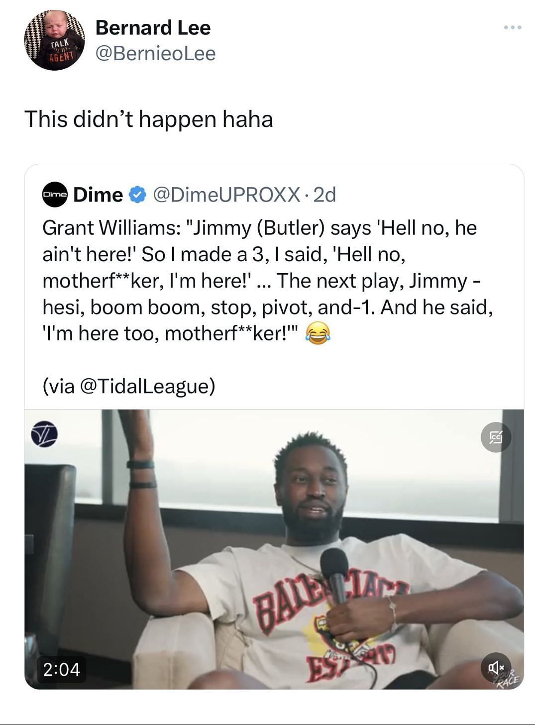 Jimmy Butler's agent, Bernard Lee, wasted no time upon hearing Grant Williams' comments. Lee retweeted the video of Williams' podcast appearance and captioned it saying: