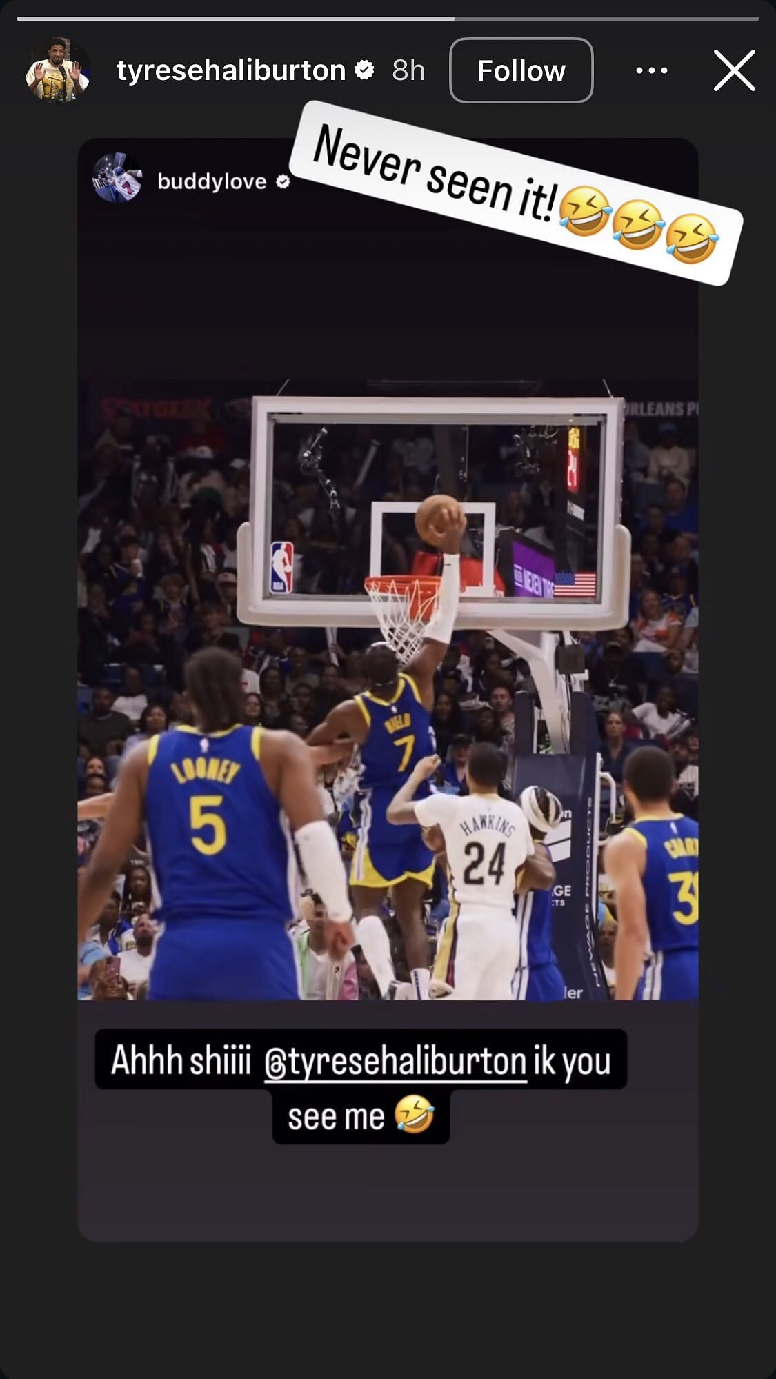 Buddy Hield posted a clip of a dunk he made during the game on his Instagram Story and then playfully called out Tyrese in the captions: