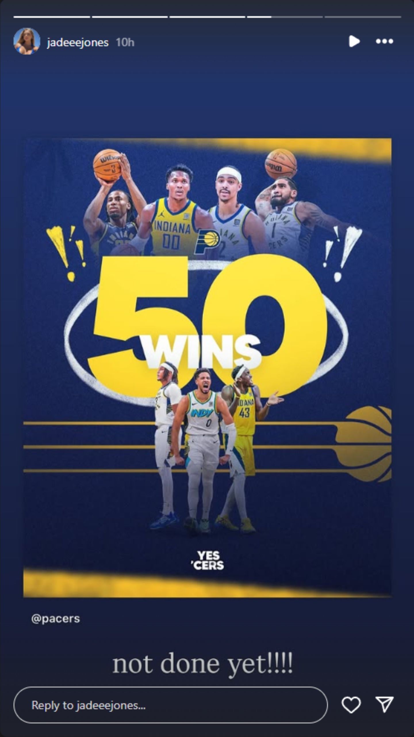 In a post on her Instagram stories, Jones shared a graphic featuring Haliburton and the Pacers celebrating their 50th win of the season. It was Indiana's first 50-win season since 2013-14, when Paul George led the Pacers to the Eastern Conference Finals.