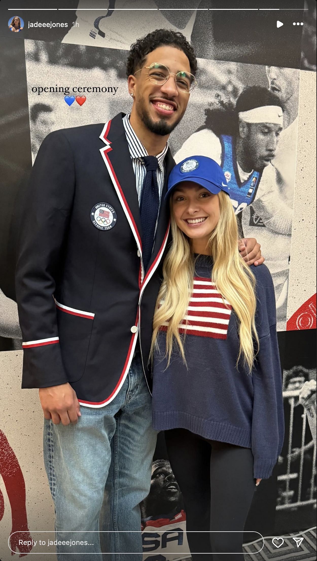 In a photo shared to Jones' Instagram story, the couple can be seen together with Haliburton wearing his Team USA blazer along with a pair of jeans. The photo was one of several that Jones shared of the couple over the past day, showing the Pacers star playing an arcade game the night before the Opening Ceremony.