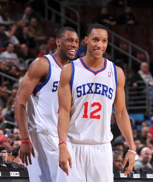 Evan Turner #12 and Thaddeus Young #21 of the Philadelphia 76ers smile during the game against the Sacramento Kings on January 10, 2012 at the Wells Fargo Center in Philadelphia, Pennsylvania. (Getty Images)