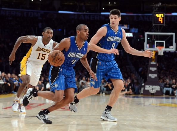 Arron Afflalo #4 of the Orlando Magic drives to the basket with Nikola Vucevic #9 as Metta World Peace #15 of the Los Angeles Lakers gives chase during a 113-103 Magic win at Staples Center on December 2, 2012 in Los Angeles, California. (Getty Images)