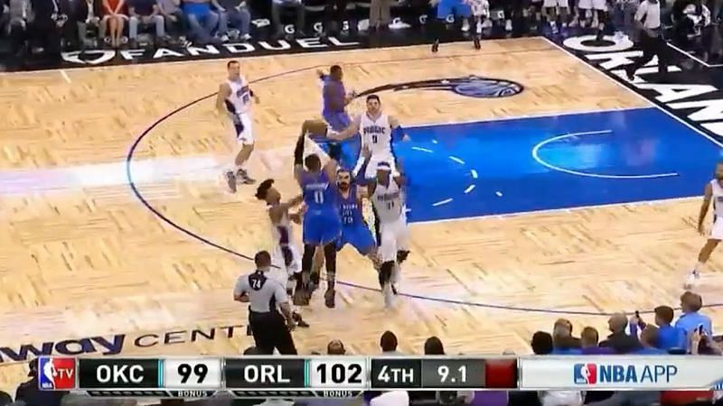 Next on the list is the return game vs Orlando in the 2016-2017 season and if you thought Russ was great against them early in the season, this game was truly unbelievable. Before we get to the stat line, let's talk about the defining play of this game. With 14 seconds left, Nikola Vucevic missed his second free throw from the line keeping the Magic lead at 102-99. Russ grabbed the rebound, went brought the ball up the court and drained the game-tying three over two Magic defenders to force overtime. If a game later on the list didn't happen, this probably would have been the defining sequence of Russ' historic season.