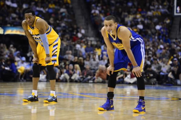 Andre Iguodala (9) and Stephen Curry (30) take a breather during a break in the action in the third quarter. The Denver Nuggets took on the Golden State Warriors in Game 2 of the Western Conference First Round Series at the Pepsi Center in Denver, Colo. on April 23, 2013. (Getty Images)