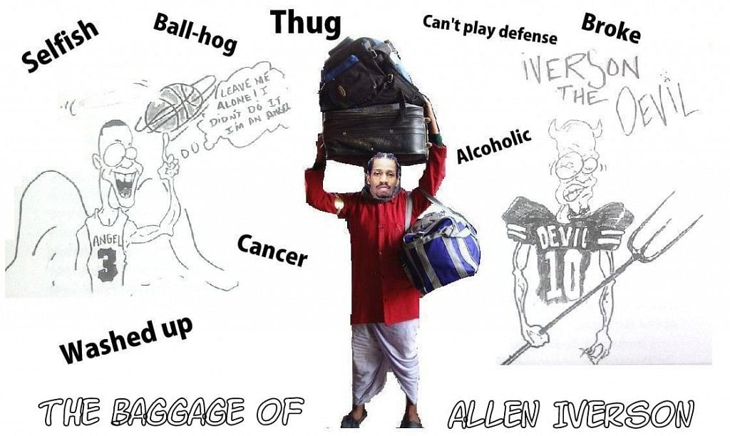 1. Issues with his game and image1.1. Me, myself and Iverson. Selfish ball-hog who can’t make his teammates better.1.2. Defensive liability.1.3. Chucker. Inefficient scorer.1.4. Cancer. Team-killer. Can’t make his team better.1.5. Washed up. Has lost a step. Can only contribute off the bench.1.6. Looks like a thug.1.7. Practice? We talkin’ bout practice?