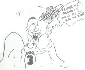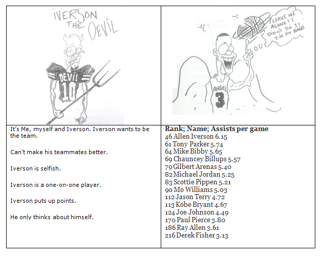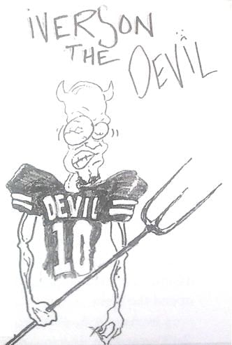 When he was 18 years old, to illustrate ‘propaganda’ in social studies, Iverson drew an illustration to show how others were seeing him through portrayals in the media – as an angel and a devil. In that spirit, on the left column you can see the anti-Iverson side of the issue, and on the right column the pro-Iverson side of it.