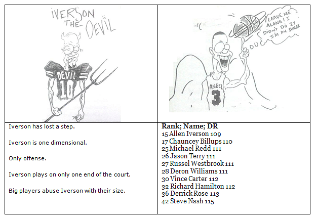 People may point out that Iverson is barely 6 feet tall and hence a liability on defense. Consider the following two quotes on Iverson’s defense; the first quote is from Michael Curry, Iverson’s head coach in Detroit and the second one is from his school days.