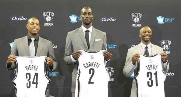 Kevin Garnett #2, Paul Pierce #34, and Jason Terry #31 of the Brooklyn Nets pose with their new jerseys during a press conference at the Barclays Center on July 18, 2013 in the Brooklyn borough of New York City. (Getty Images)