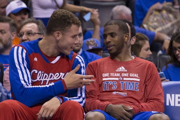 Blake Griffin #32 and Chris Paul #3 of the Los Angeles Clippers sit on the bench in Game 1 of the Western Conference Semifinals against the Oklahoma City Thunder during the 2014 NBA Playoffs at the Chesapeake Arena on May 5, 2014 in Oklahoma City, Oklahoma.