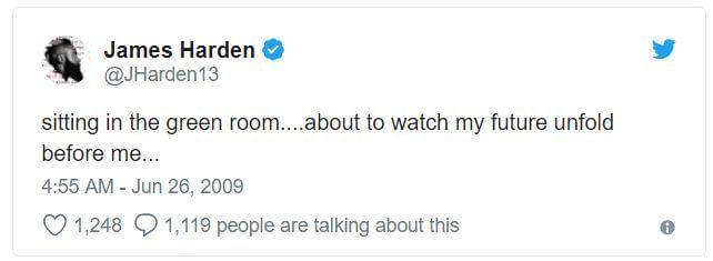 This is one of my favorite first tweets of NBA stars. It takes us down memory lane to the 2009 NBA draft when James Harden was drafted #3 overall by the Oklahoma City Thunder.