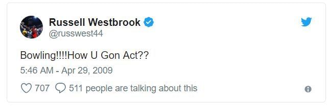 Here's an example of tweeting exactly what you're doing. Brodie's first tweet emerged in 2009 and the only logical explanation is that he tweeted this when he was bowling with his friends. Do you think Westbrook hit a strike?
