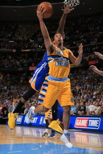 Andre Miller of the Denver Nuggets lays in the game-winning shot against Golden State Warriors on April 20, 2013. The 37-year-old Miller clinched the home win for the Nuggets in Denver, as he beat Warriors defender Draymond Green one-on-one then sailed through the air to finish off the nifty shot.