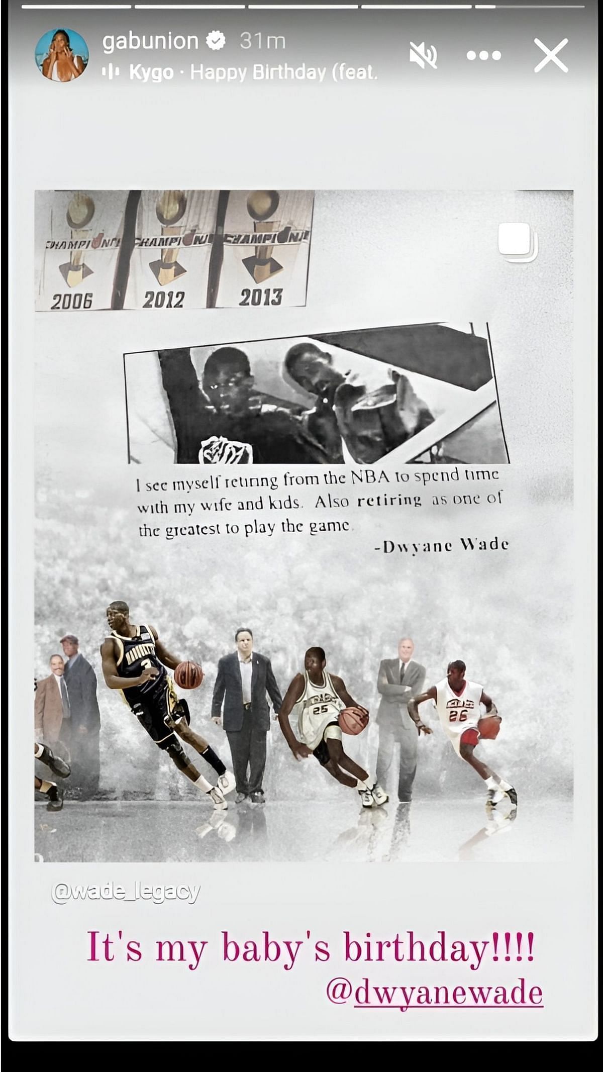 Heat legend Dwyane Wade turned 43 on Jan. 17 and his wife Gabrielle Union posted a message to celebrate him. She reposted a birthday tribute made by fan page @wade_legacy on her Instagram story that featured a quote from the three-time NBA champion about his life after basketball.