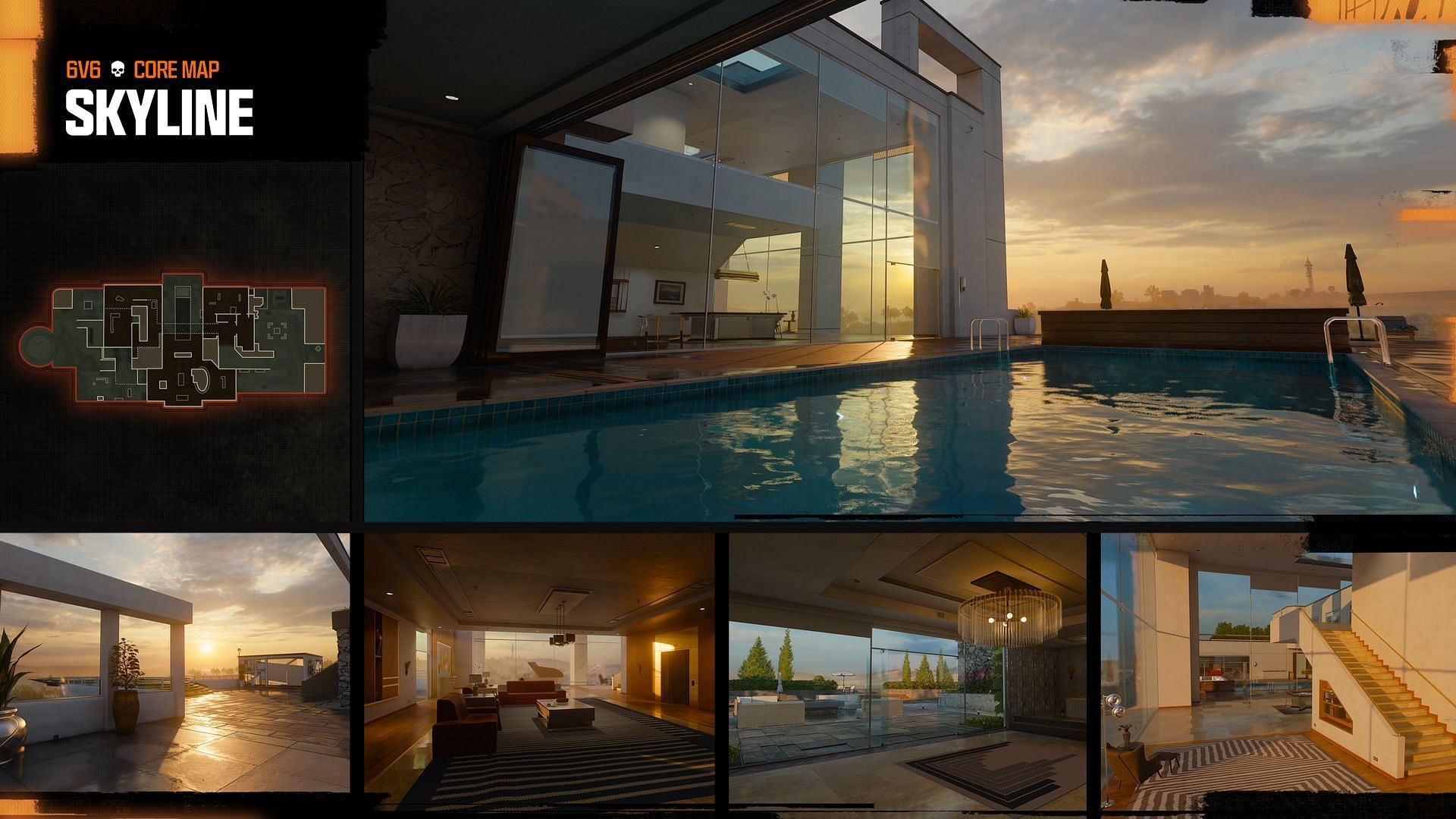 The Skyline map lets players take in breathtaking views of the surrounding countryside from the rooftop of a luxury resort that has an exquisite penthouse with access to a lounge, kitchen, gum, and pool. Moreover, players can descend into the panic room to cross under the map or fight in the open area.