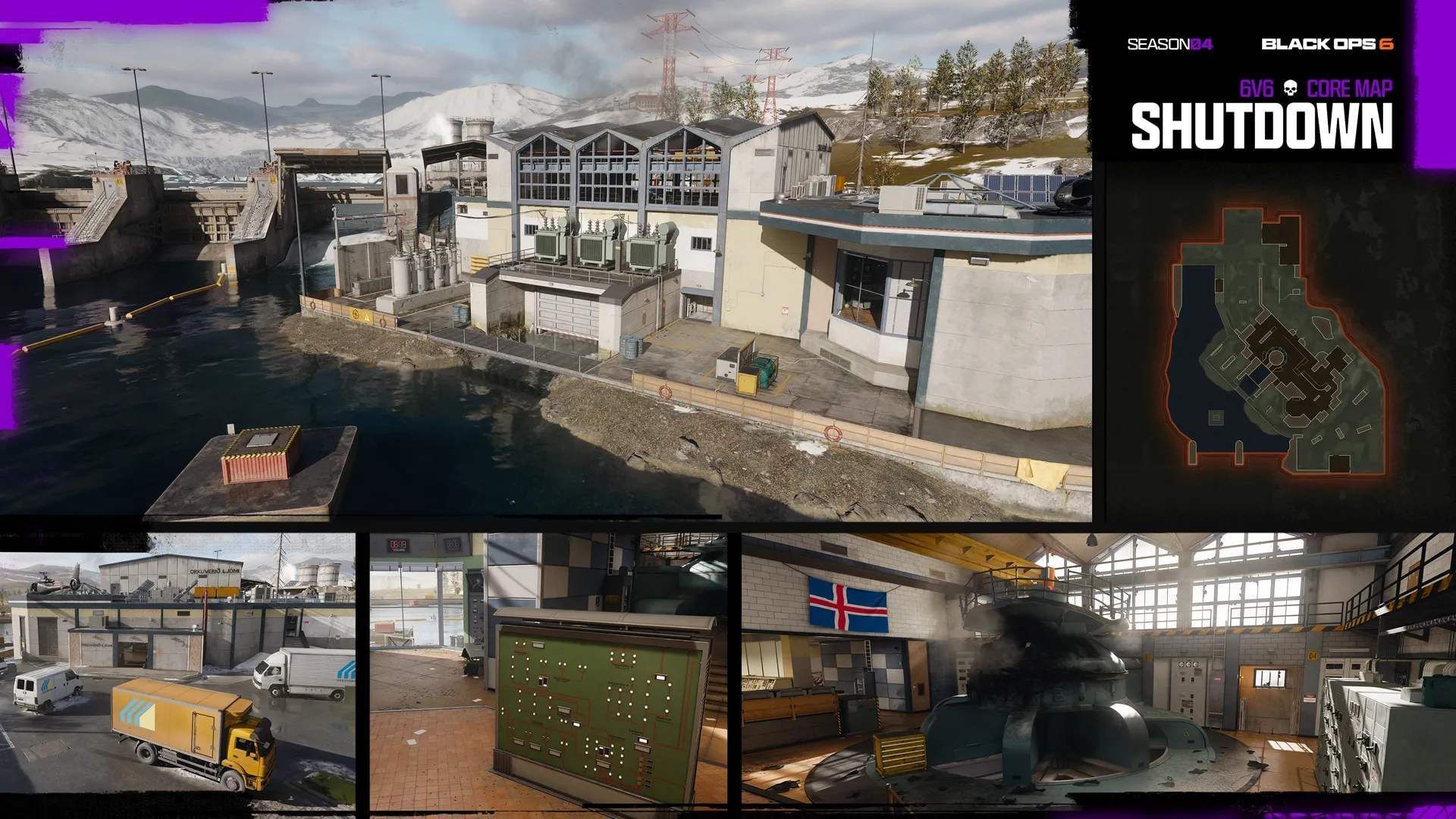 Shutdown is a small Core 6v6 map set in a hydroelectric plant within the rugged volcanic terrain of Iceland. This is one of the maps that players can access now. In it, they can expect intense close-range fights inside the central building, which houses a wrecked turbine, or take a dip in the lake located at the southern end by the transformer.