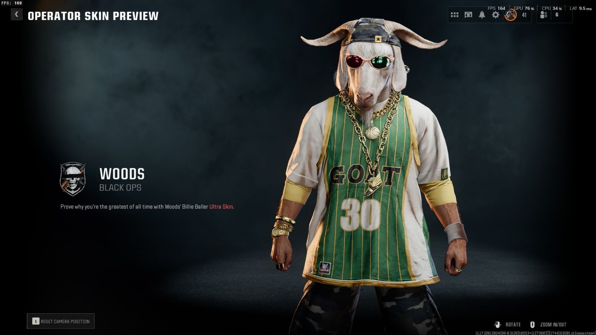 The overall look of the skin is bold and distinctive. Woods is dressed in a jersey with the number “30” and “GOAT” written on it, accessorized with several gold chains that add to the flashy aesthetic.