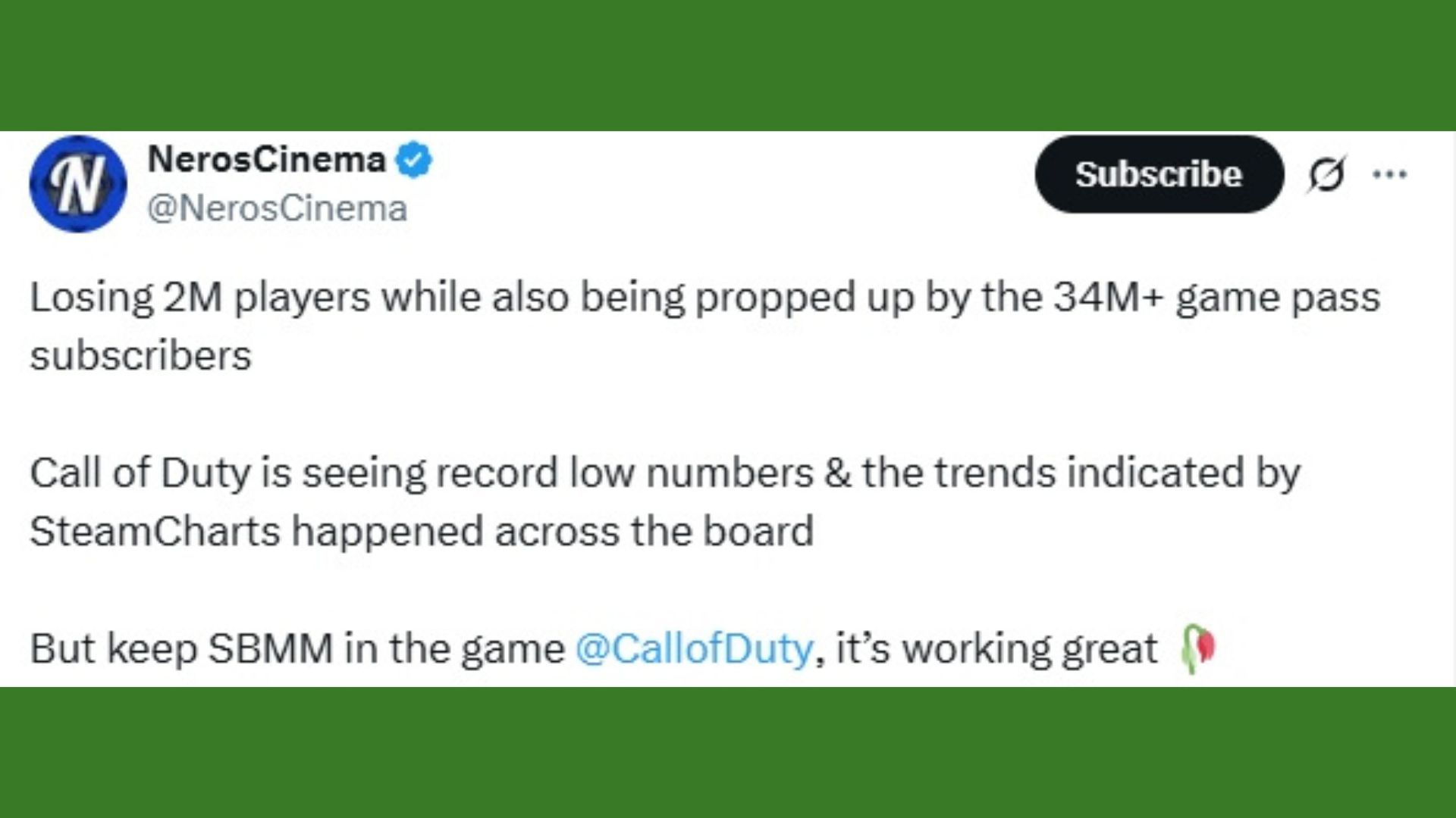 The numbers are even more concerning once one realizes that Game Pass has over 35 million subscribers worldwide. Even Steam Charts indicate high fluctuation in the numbers of players in Call of Duty, with less than 100k players online over long weeks from March to May 2025.