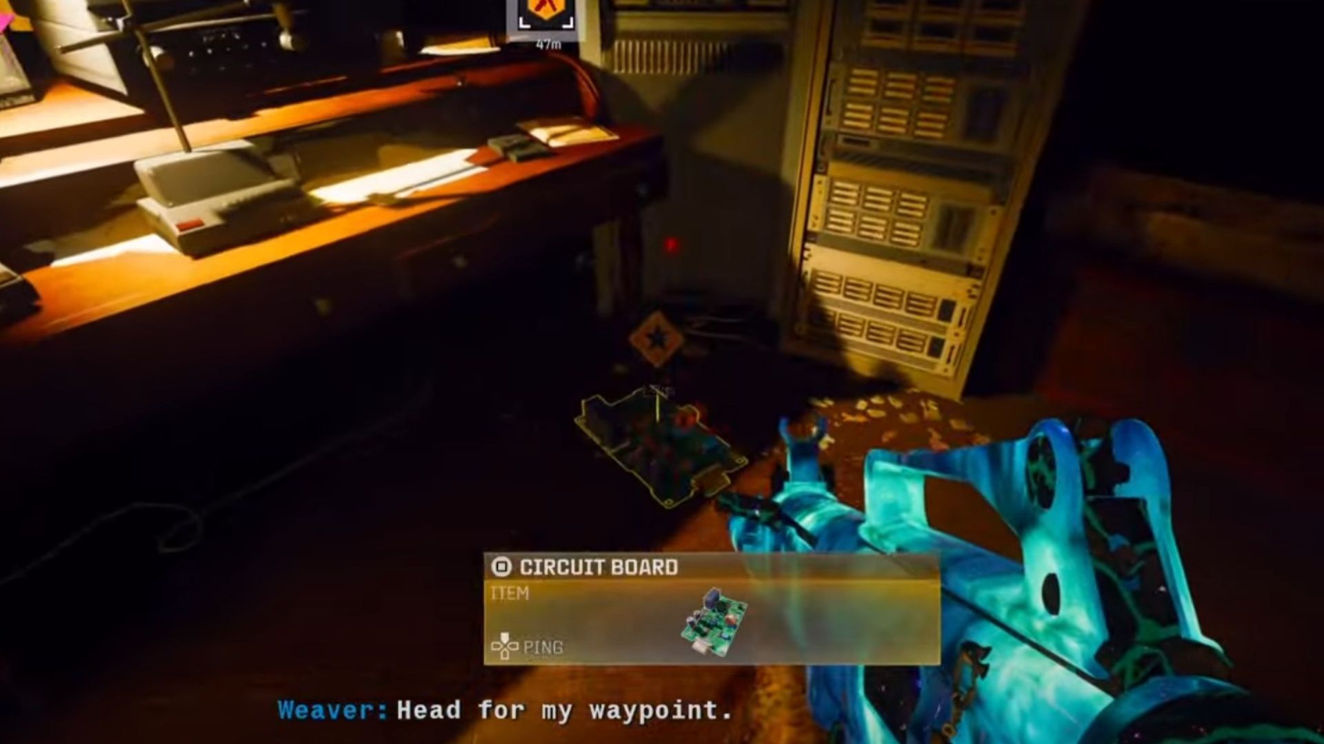 With the Fuse in hand, go to the Director's Quarters, where you'll find a computer next to a tall CPU cabinet. Look at the top part of the cabinet to spot a blinking red light. Shoot it, and the Circuit Board will drop. Collect it.