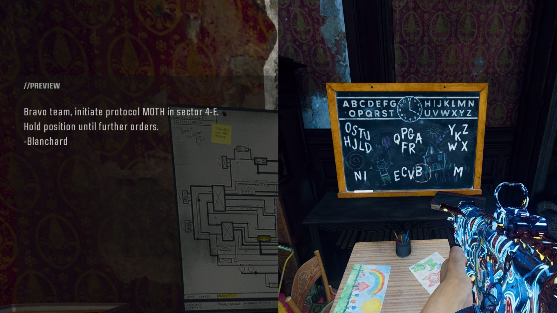 To decrypt the code, go to the Nursery, where the PhD Flopper Perk-a-Cola machine is located. Once there, look for a blackboard on the west side of the room.