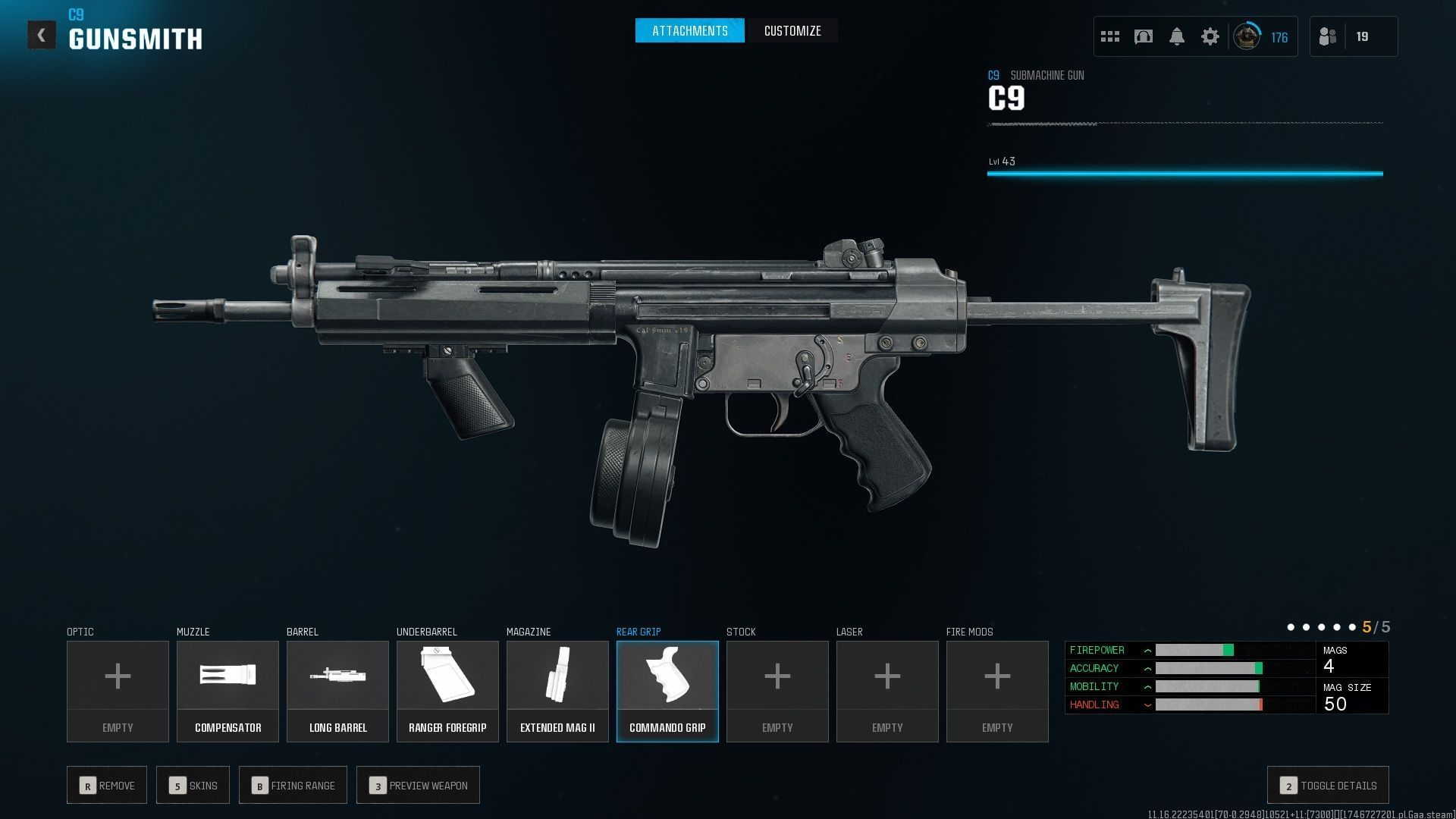 The Ranger Foregrip reduces the SMG's horizontal recoil, which can be quite unpredictable at times. It also improves your sprinting speed with the gun equipped, allowing you to play the game aggressively, which is also the type of scenario the C9 shines at.