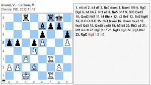 The players spent little time as the game advanced toward the 10th and 12th moves, but Anand was the happier of the two to allow the clock run weighing options even though they stuck with the expected moves. After they castled on either side with the 14th move, Anand could have forced the issue if he tried to vary the line, but he opted for the safety. Knight to e4 was perhaps the first giveaway as to where this game may have been destined.