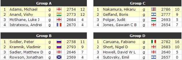 Anand won three out of his first four games and drew his last two to ensure qualification. In the football-style points system, Anand and Michael Adams of England ended the group stage with 12 points each. The final game between Anand and Adams was a drawn affair which meant that Adams finished top of the group while Anand finished second. The groups finished in the following order