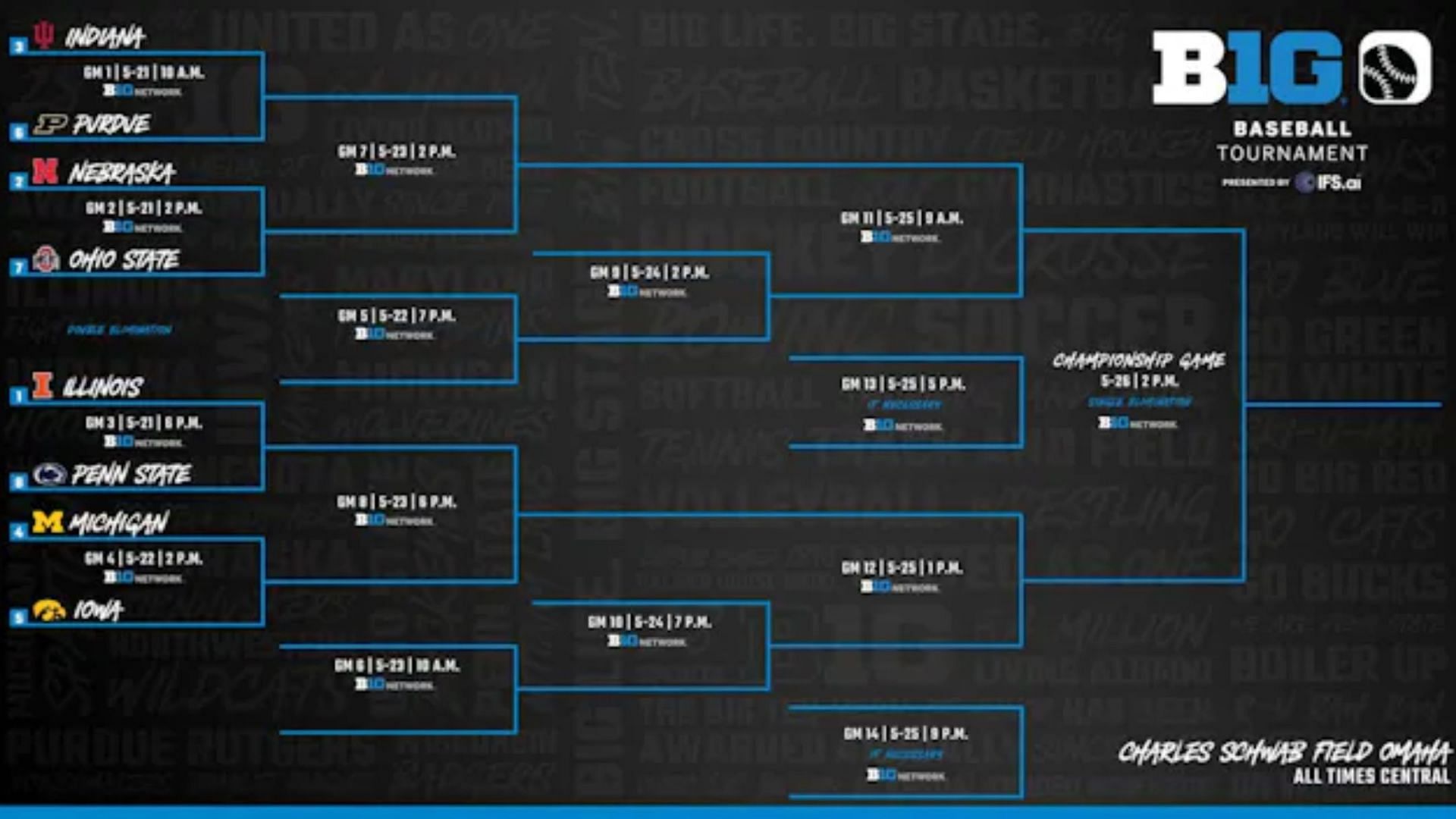 The eight teams that made it to the tournament are Illinois, Nebraska, Indiana, Iowa, Michigan, Purdue, Ohio State and Penn State. The double-elimination games will begin on Tuesday and the final is on Sunday, May 26.