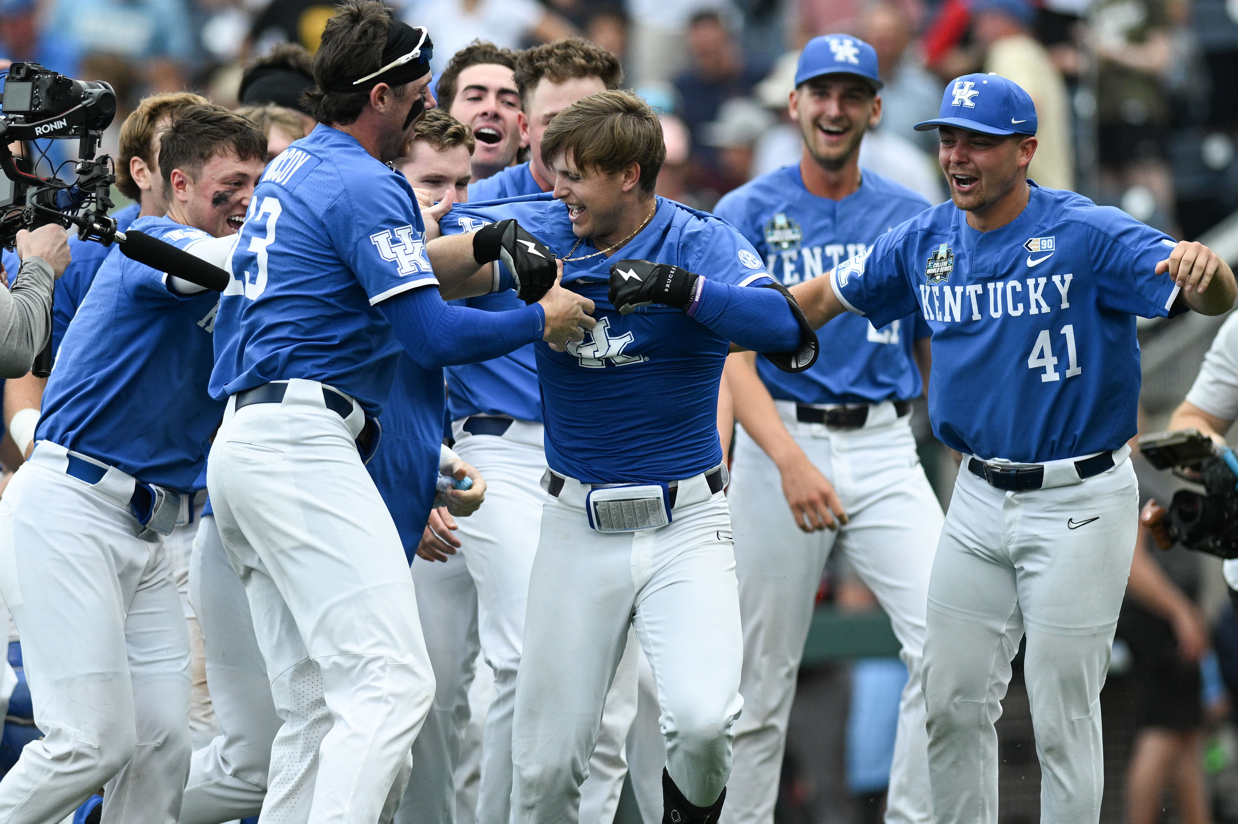 Third baseman Mitchell Daly delivered the game-winning home run for the Wildcats with two outs in the 10th. The walk-off homer gave first-time CWS entrants Kentucky its first win in Omaha.