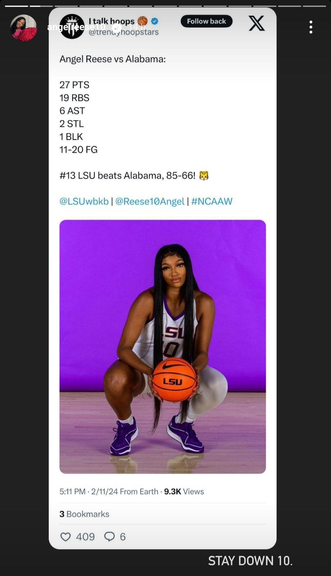 Angel Reese, who has an On3 NIL valuation of $1.7 million, hyped up her performance after the game on her Instagram stories with the caption: