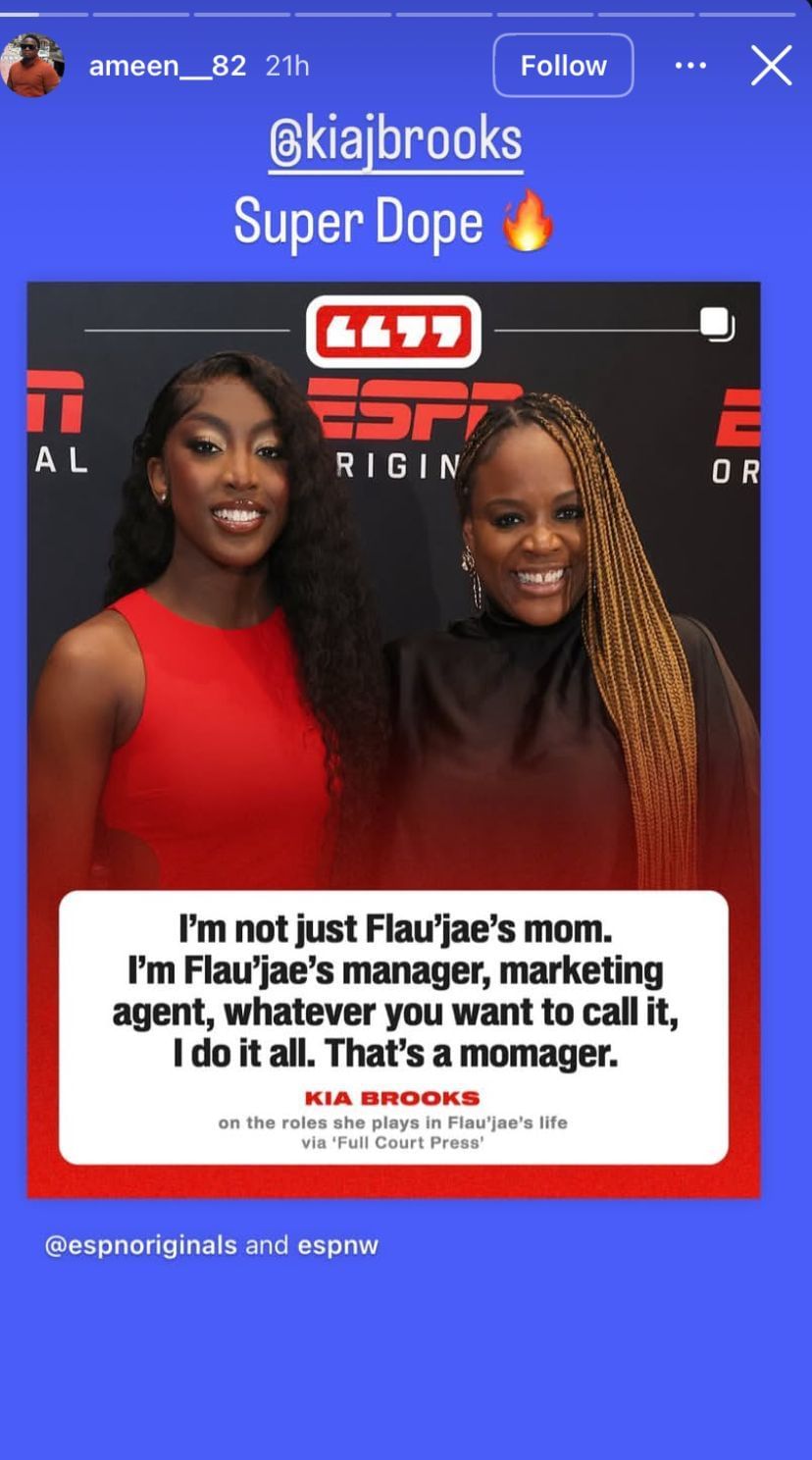 Flau’jae Johnson’s stepdad, Ameen Brooks, was a proud husband after he reacted to comments from his wife, Kia Brooks, on social media. In an Instagram post from ESPN Originals on Saturday, Kia commented about her role in her daughter’s life. Ameen reacted on his Instagram story on Saturday, sharing the post.